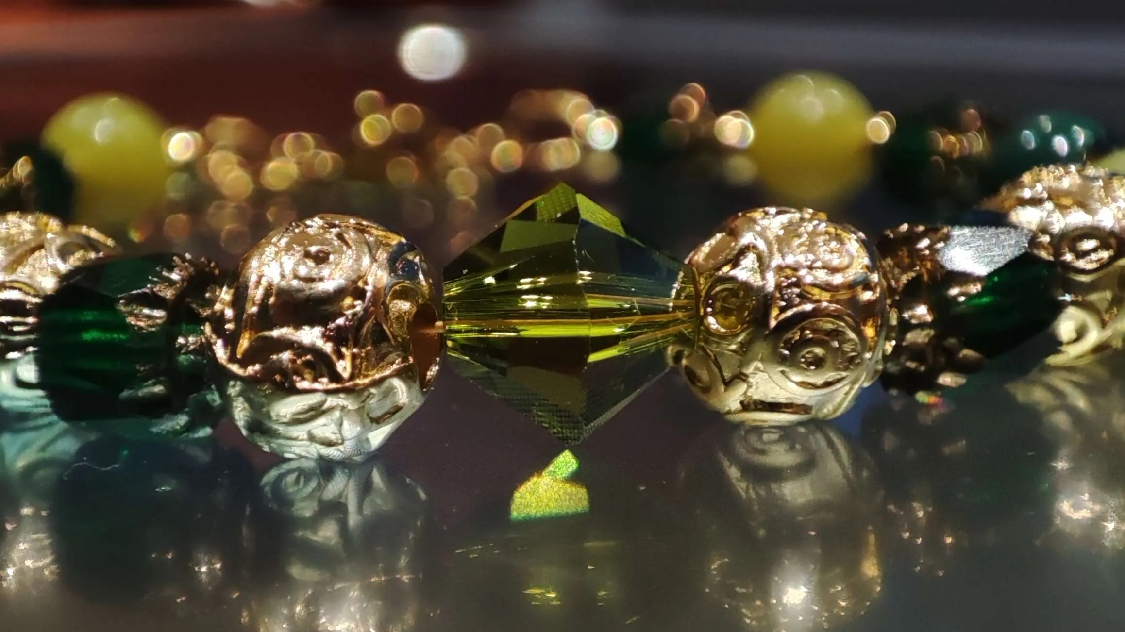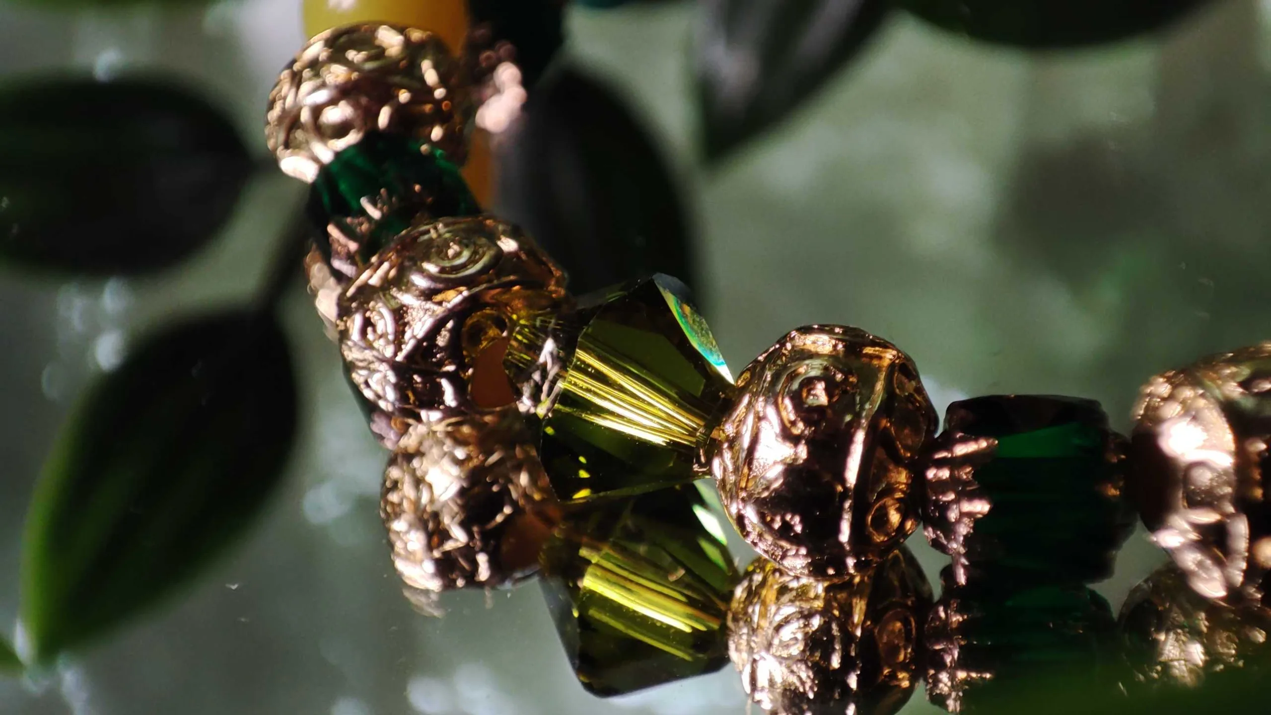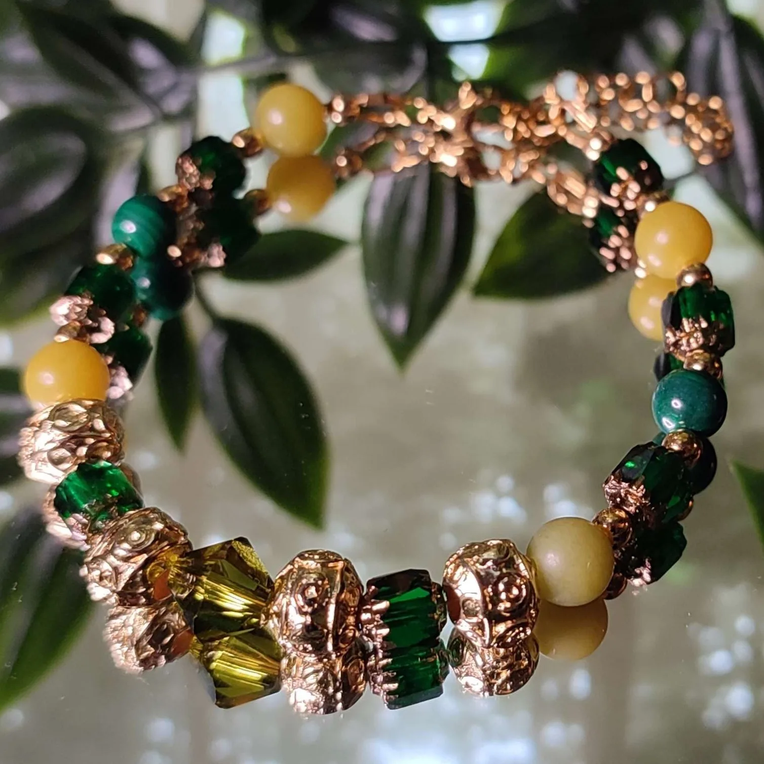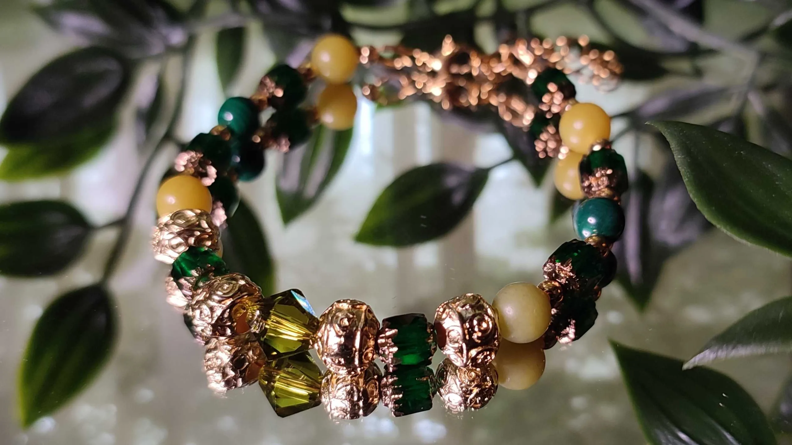 Inspiré de la grande Circé, magicienne puissante représentée à travers des perles vert forêt, les pierres de jade et de malachite. Des touches dorés rappellent son grand pouvoir et sa parenté avec les dieux.