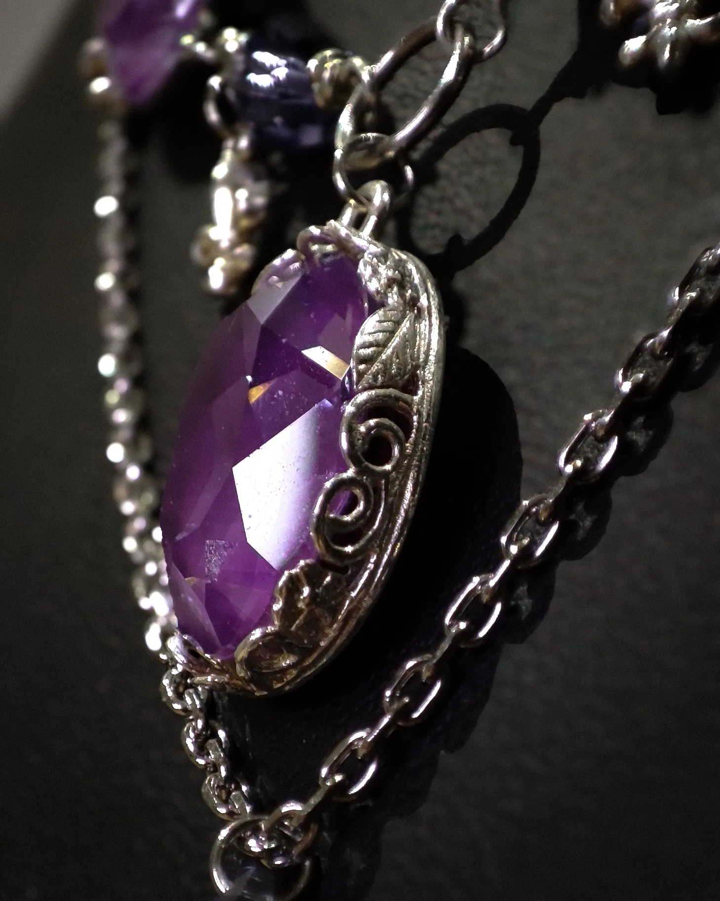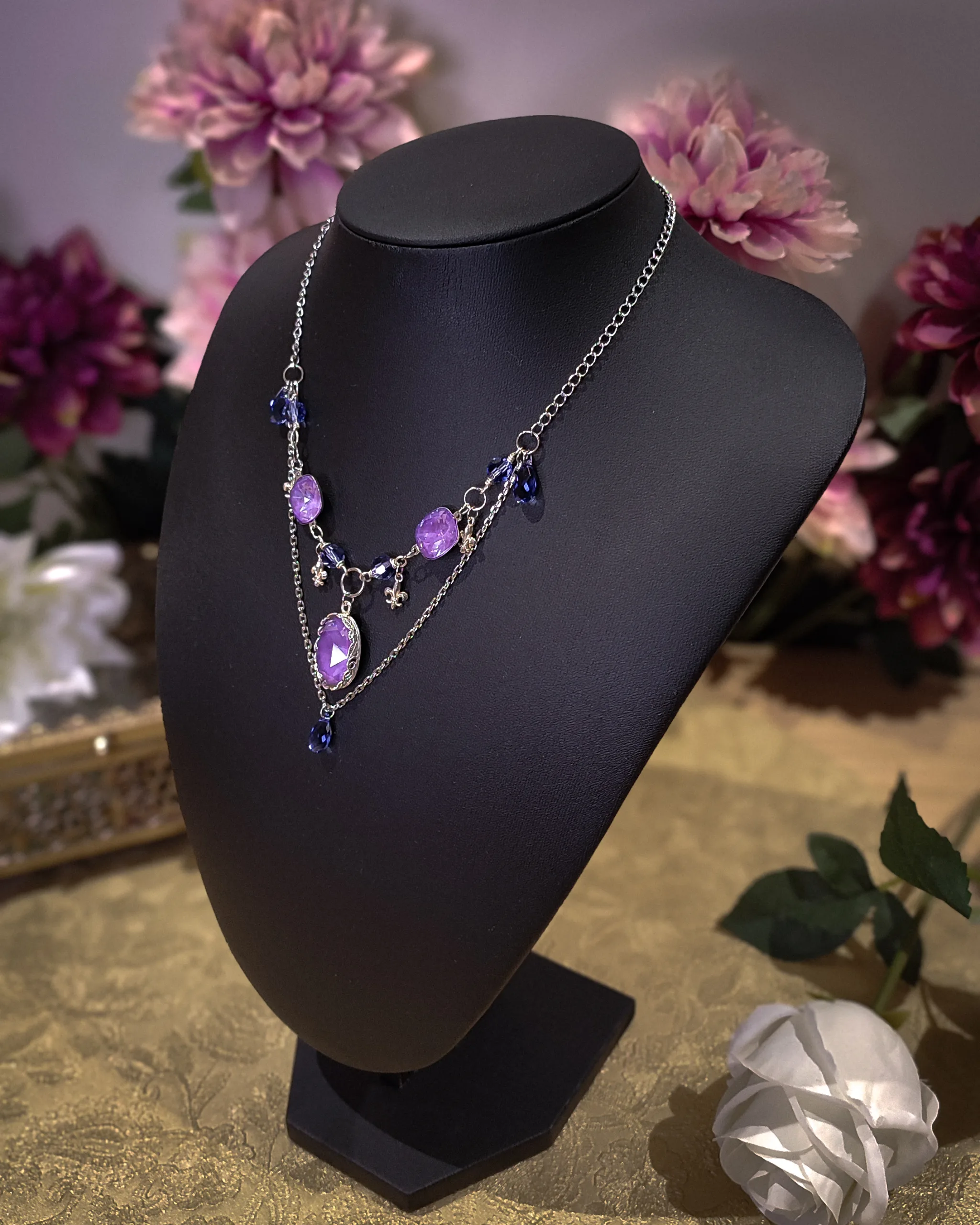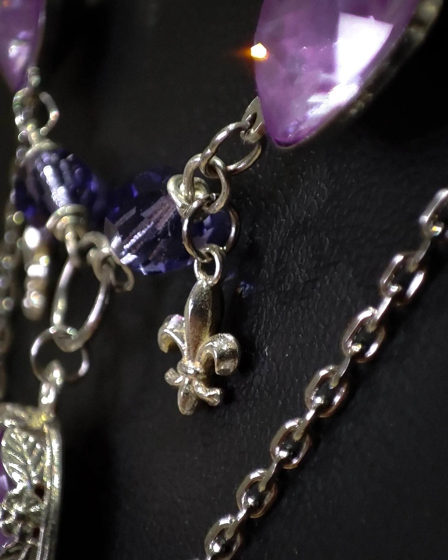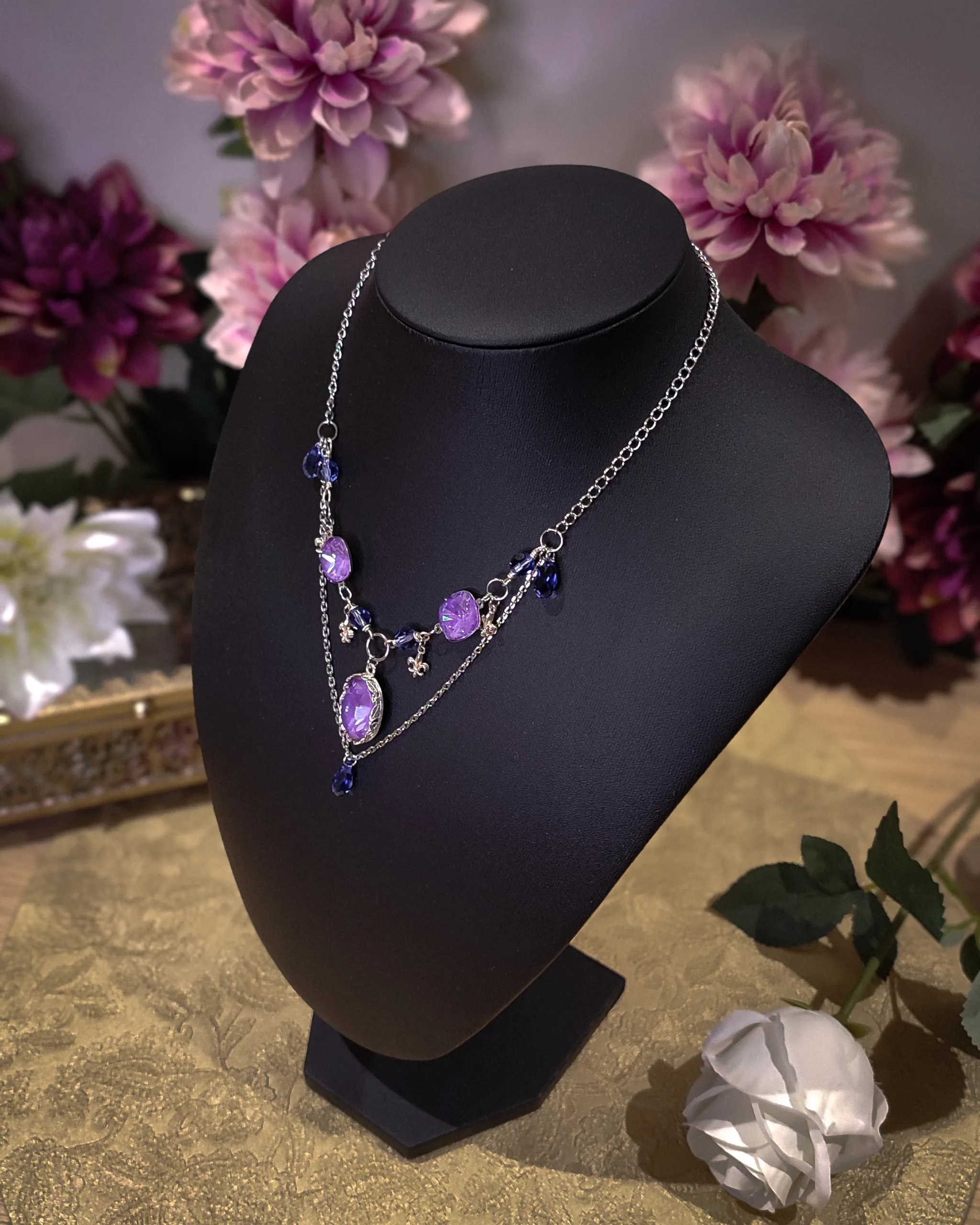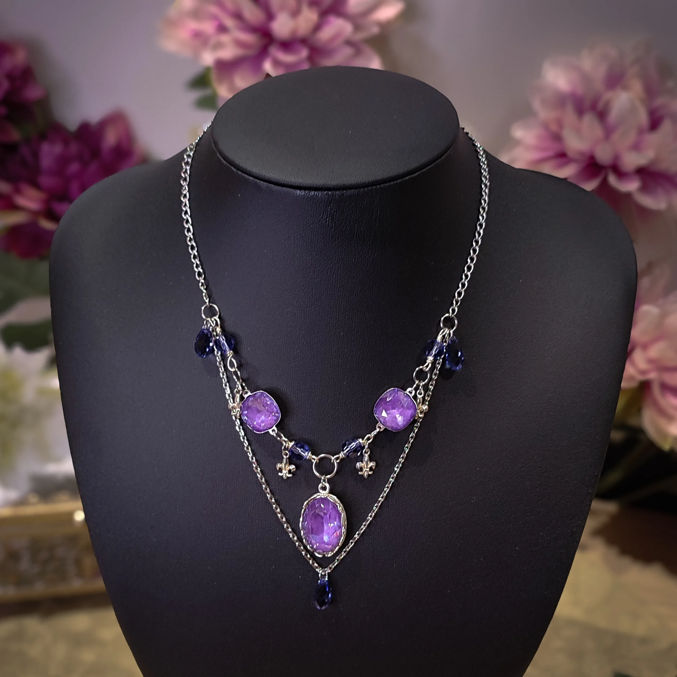 Ce collier est fait de laiton plaqué argent, d’argent, d’acier inoxydable, de perles et cristaux Swarovski violet, garantis sans nickel, ni plomb, ni cadmium.