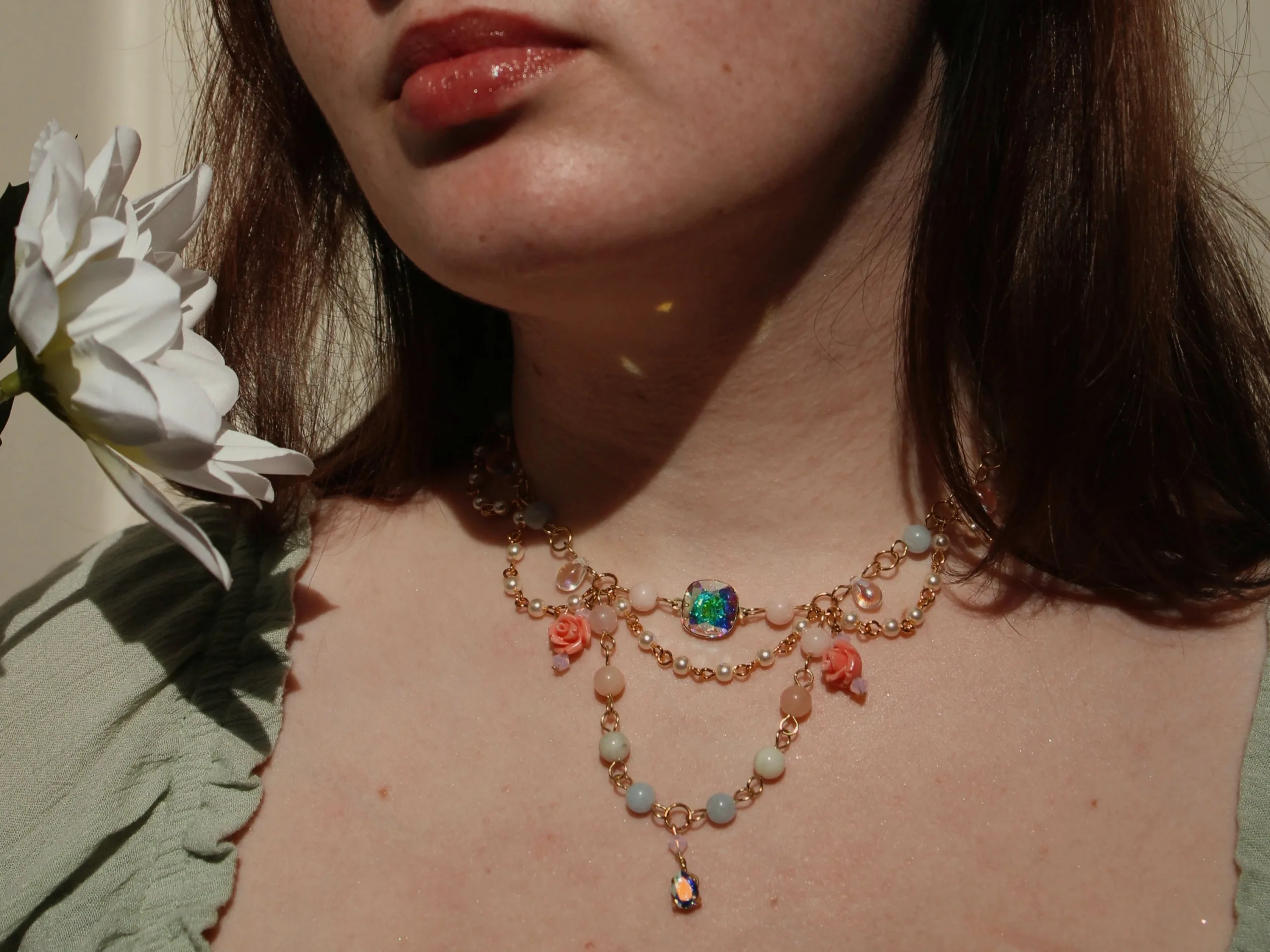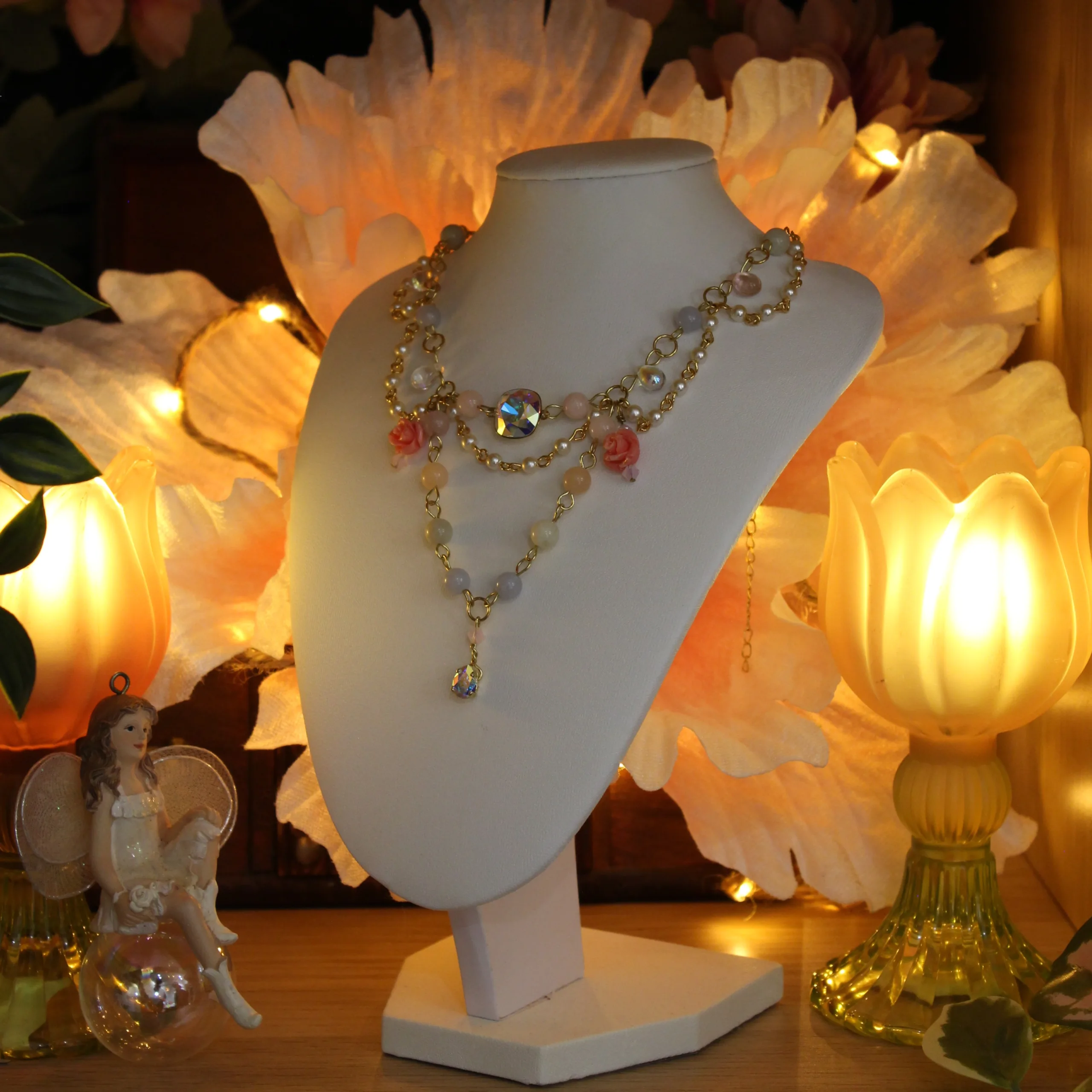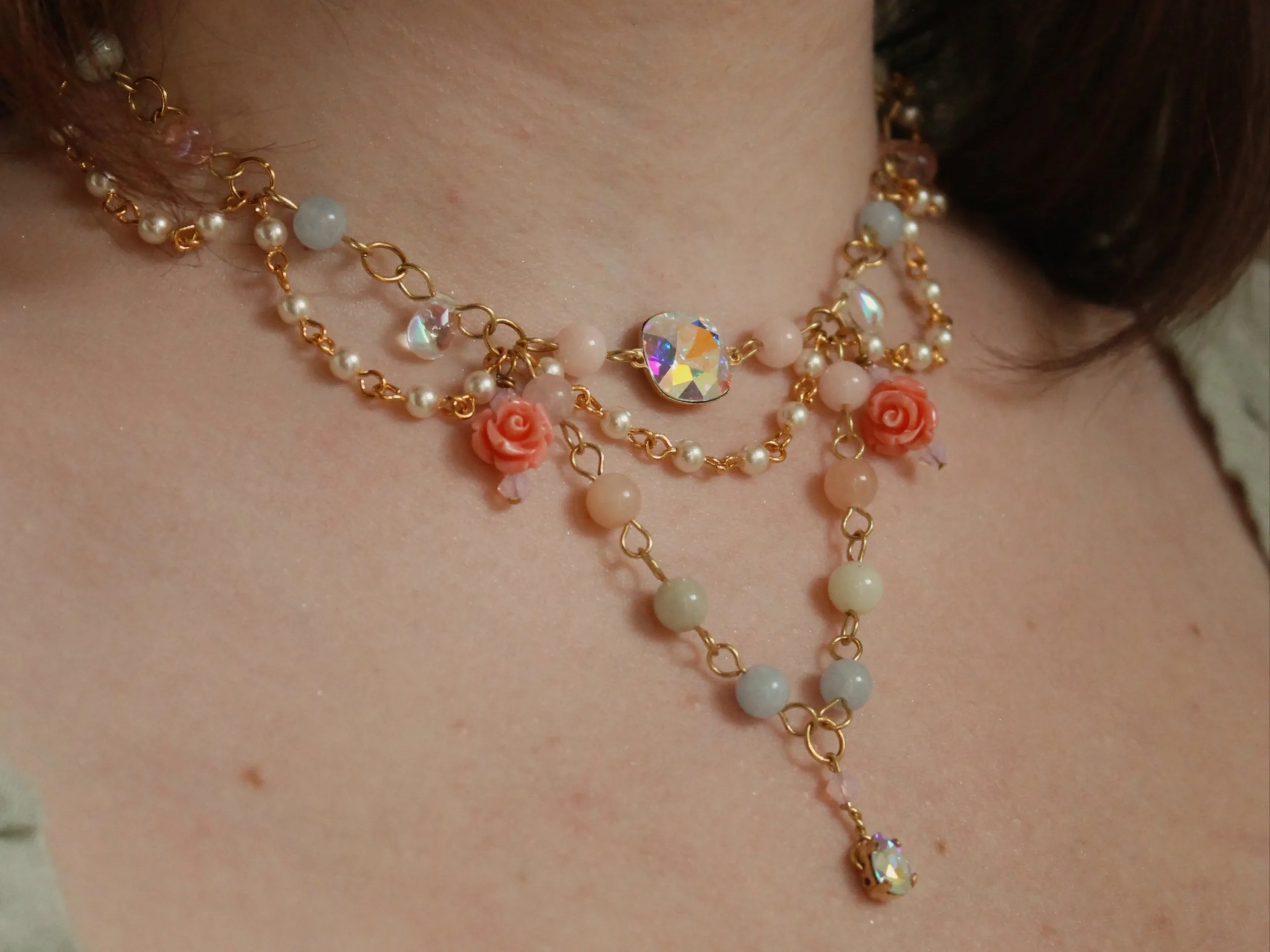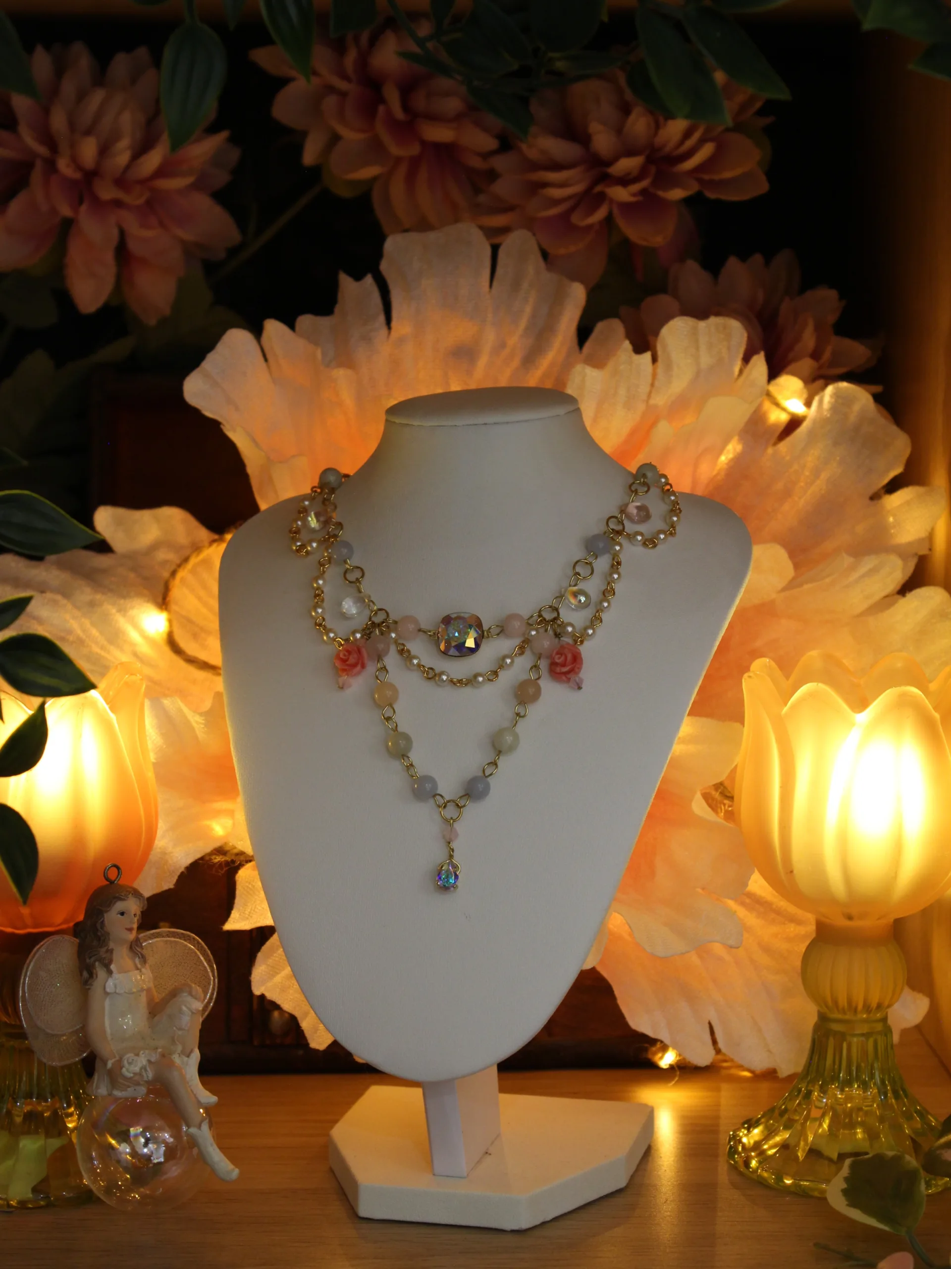 Ce collier est fait d’acier inoxydable, de breloques dorées, de cristaux et de perles de morganite, garantis sans nickel, ni plomb, ni cadmium.