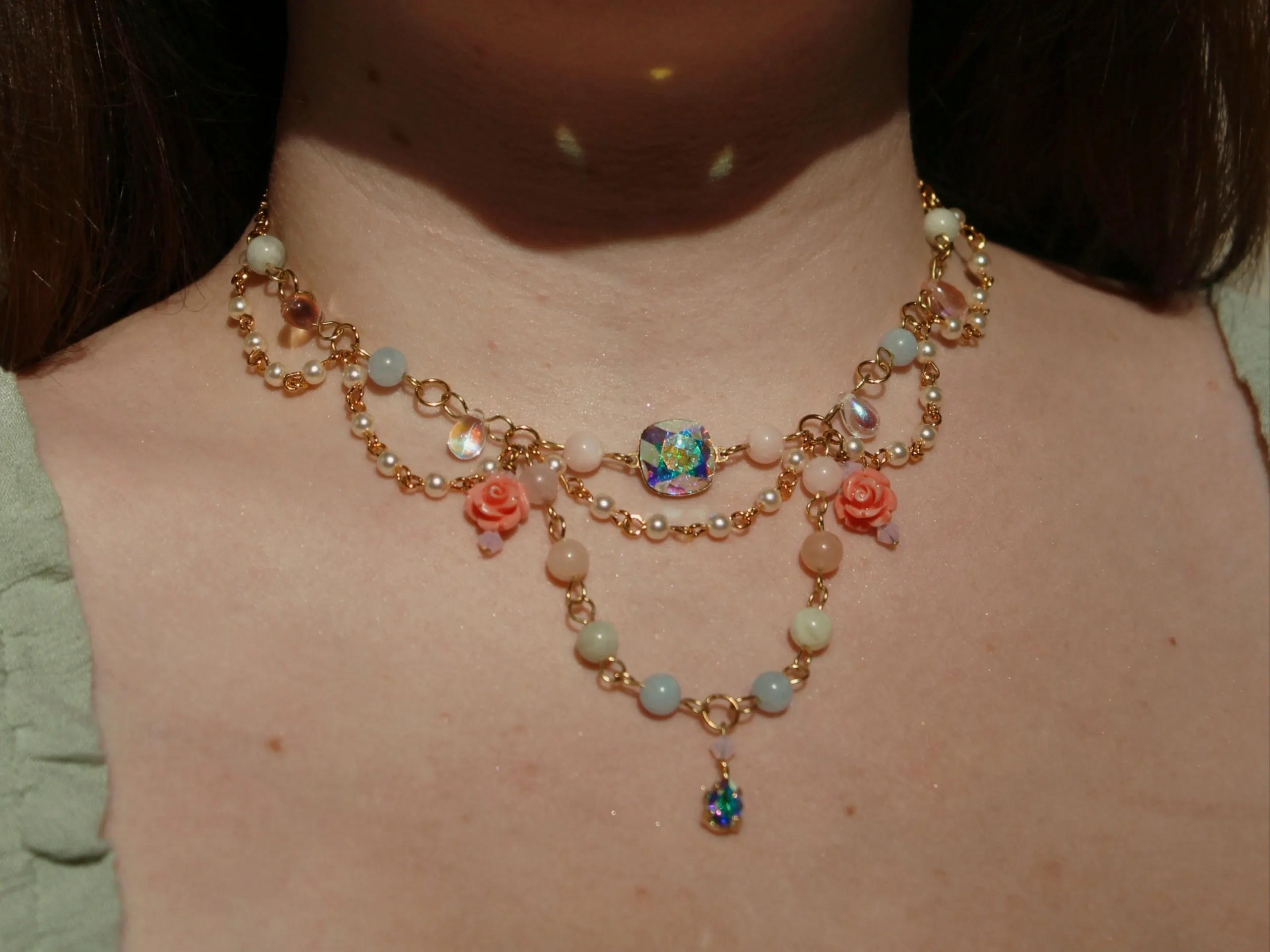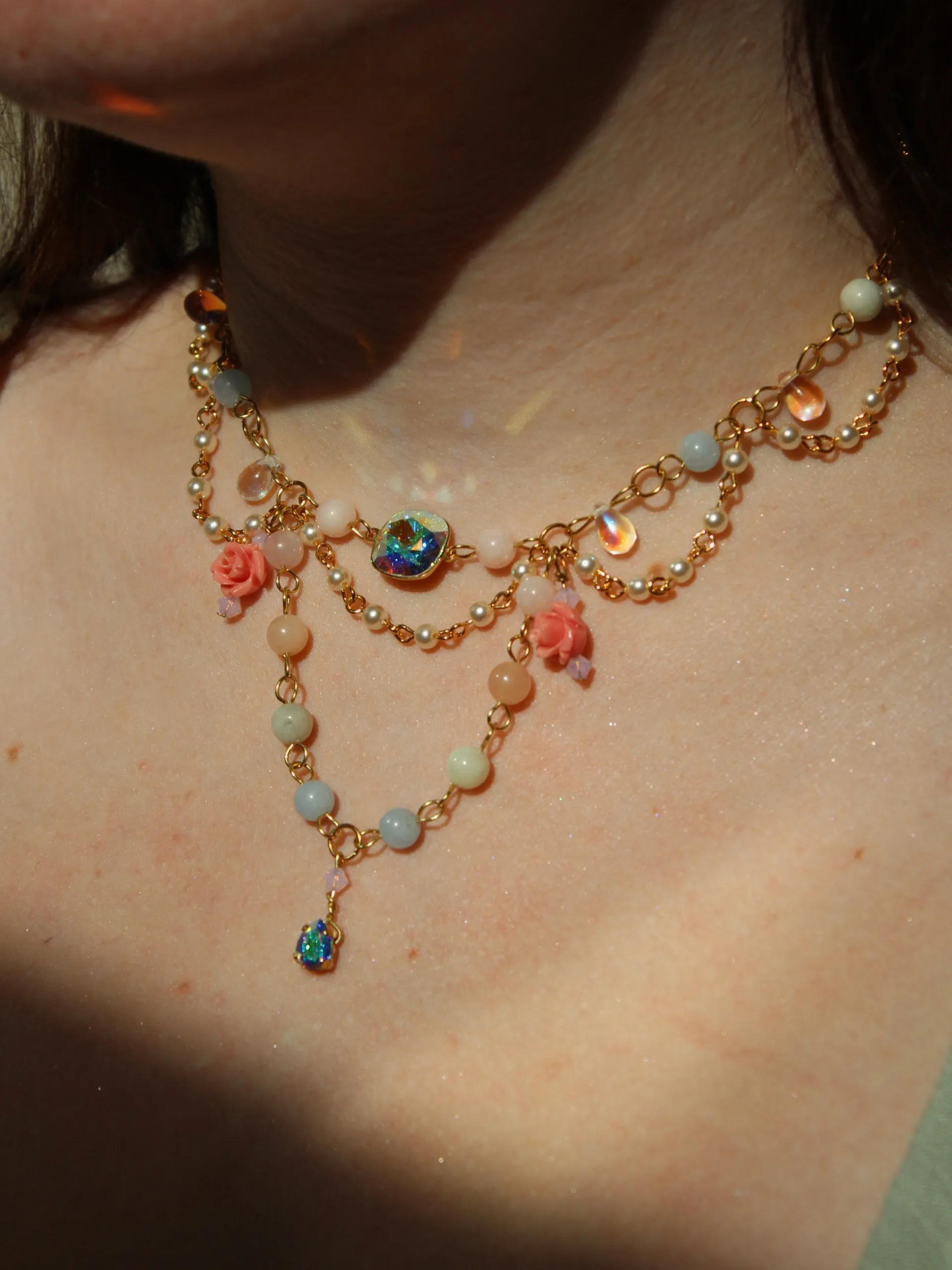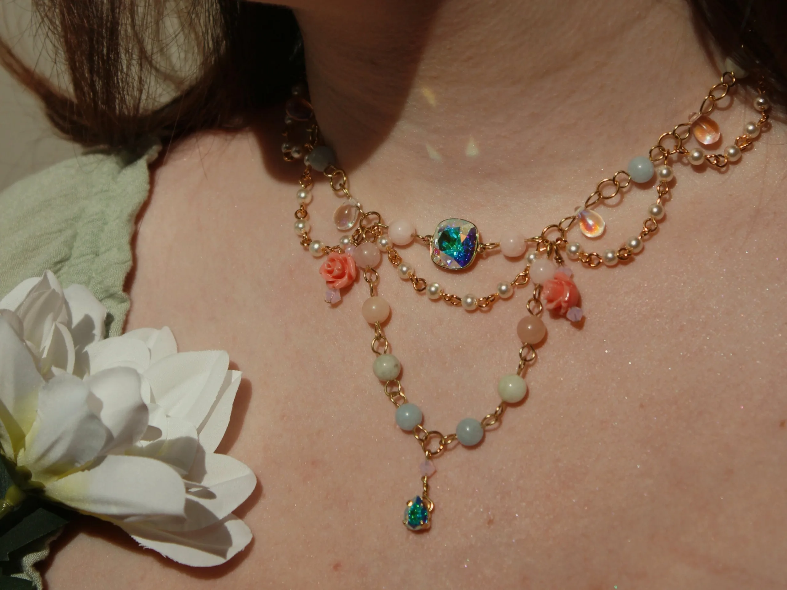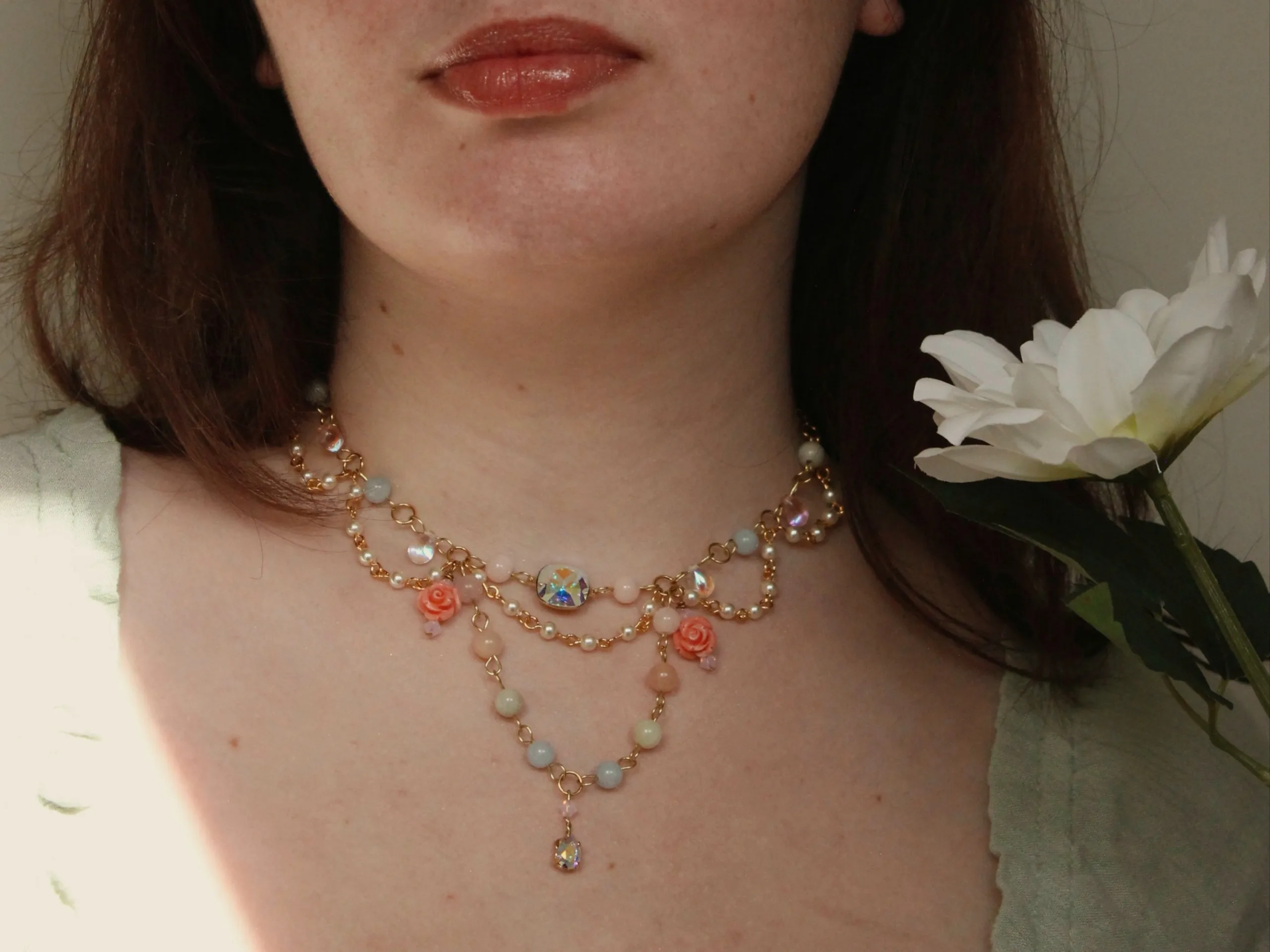 Ce collier est fait d’acier inoxydable, de breloques dorées, de cristaux et de perles de morganite, garantis sans nickel, ni plomb, ni cadmium.