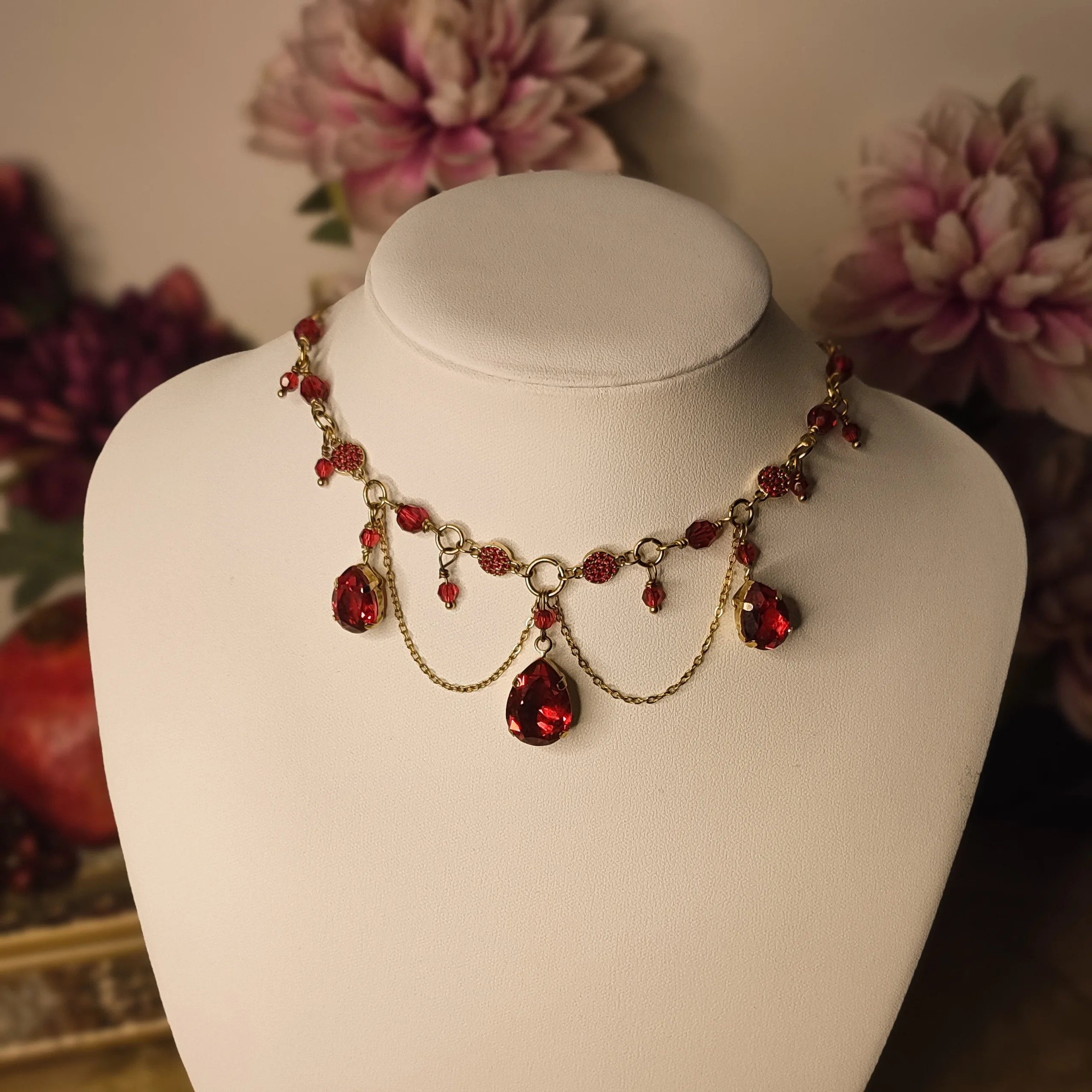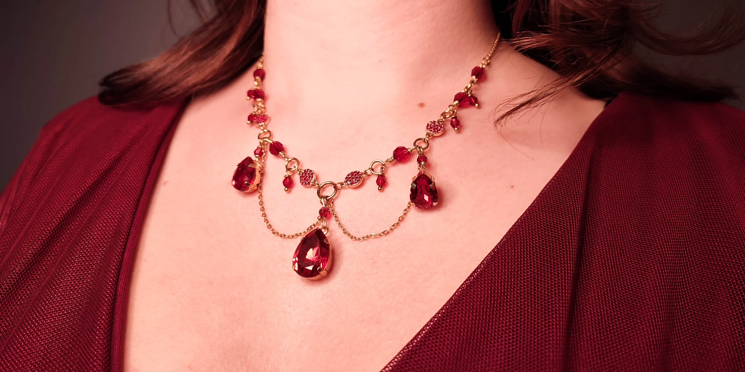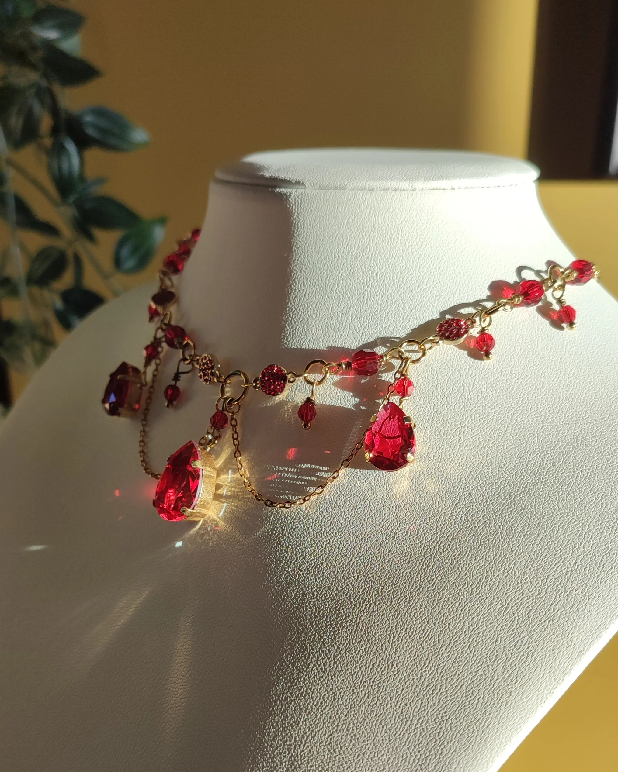 Ce collier est fait de laiton doré à l’or fin, d’acier inoxydable doré, de perles et cristaux Swarovski rouges, garantis sans nickel, ni plomb, ni cadmium.