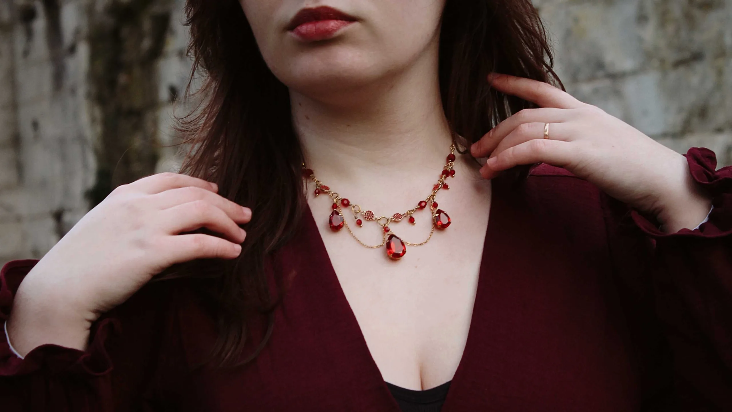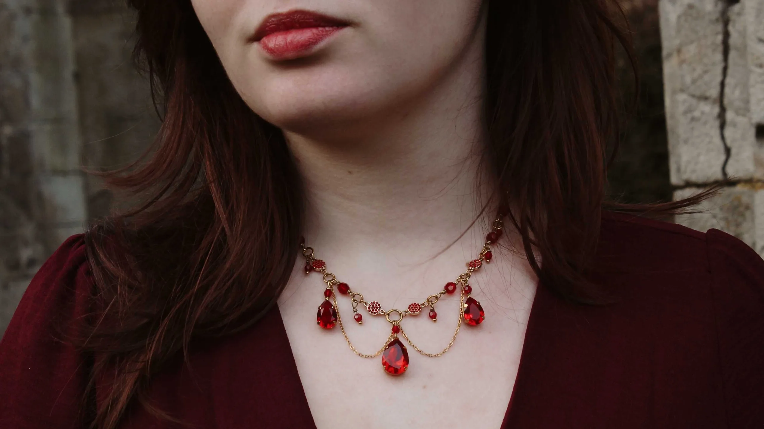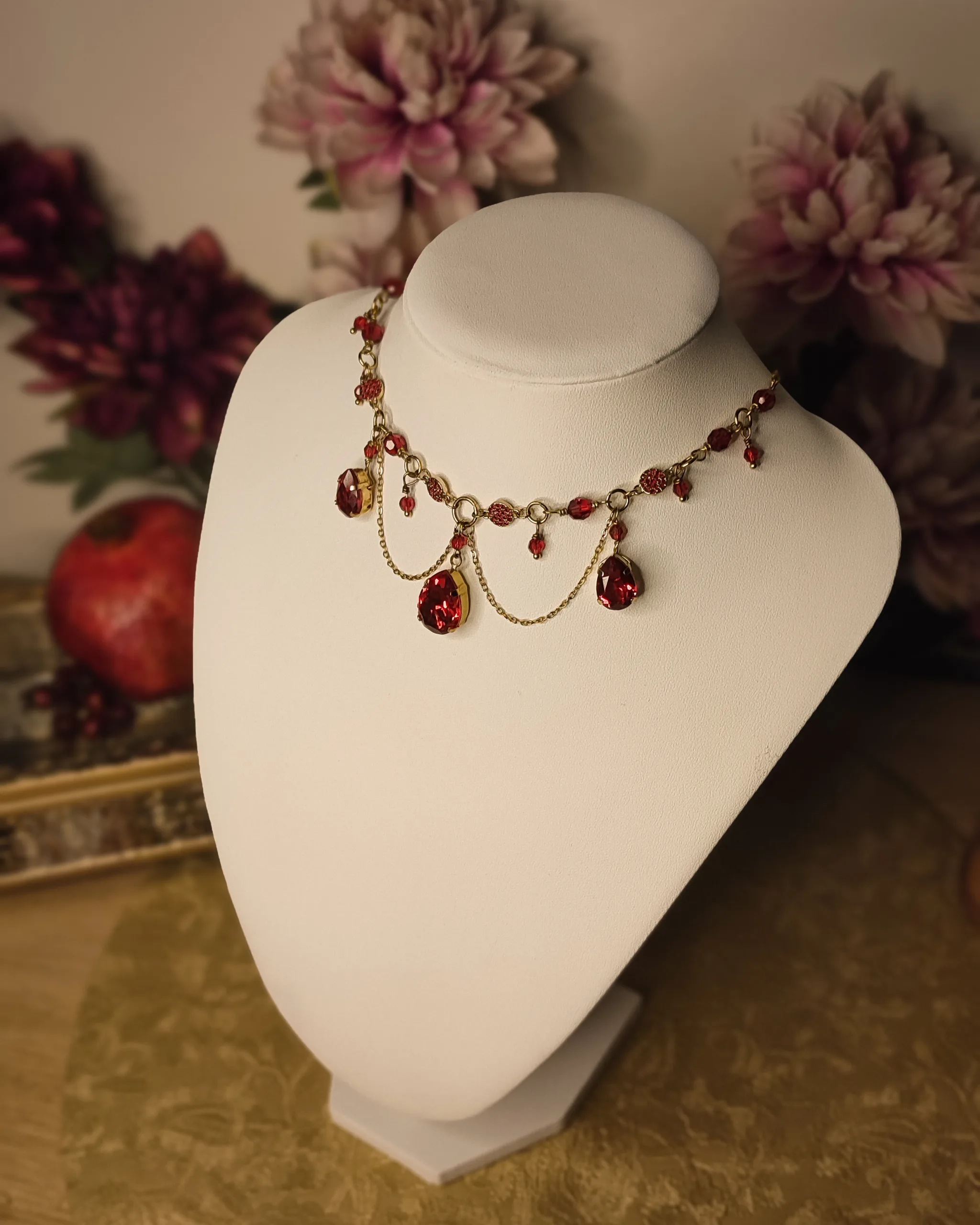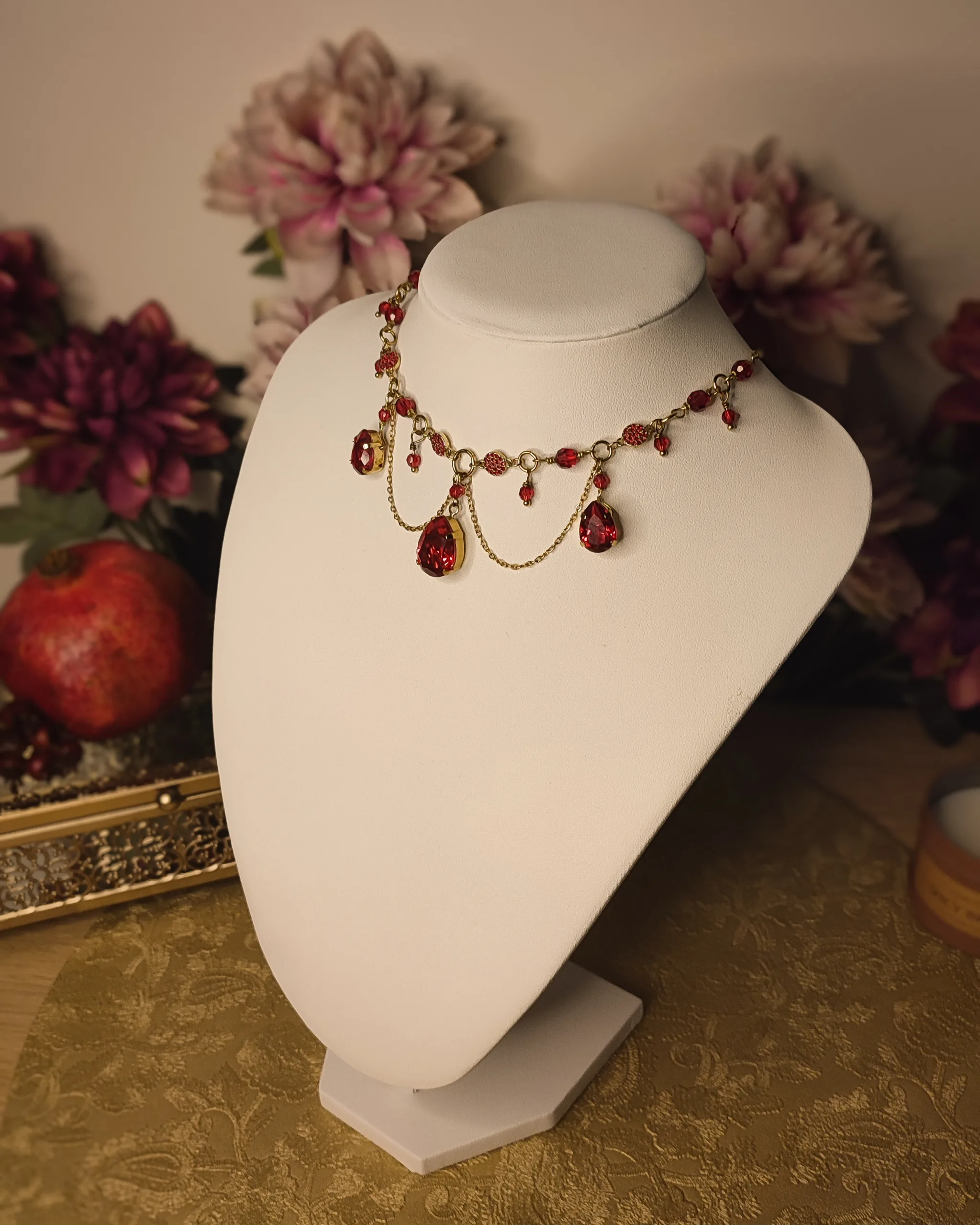 Ce collier est fait de laiton doré à l’or fin, d’acier inoxydable doré, de perles et cristaux Swarovski rouges, garantis sans nickel, ni plomb, ni cadmium.