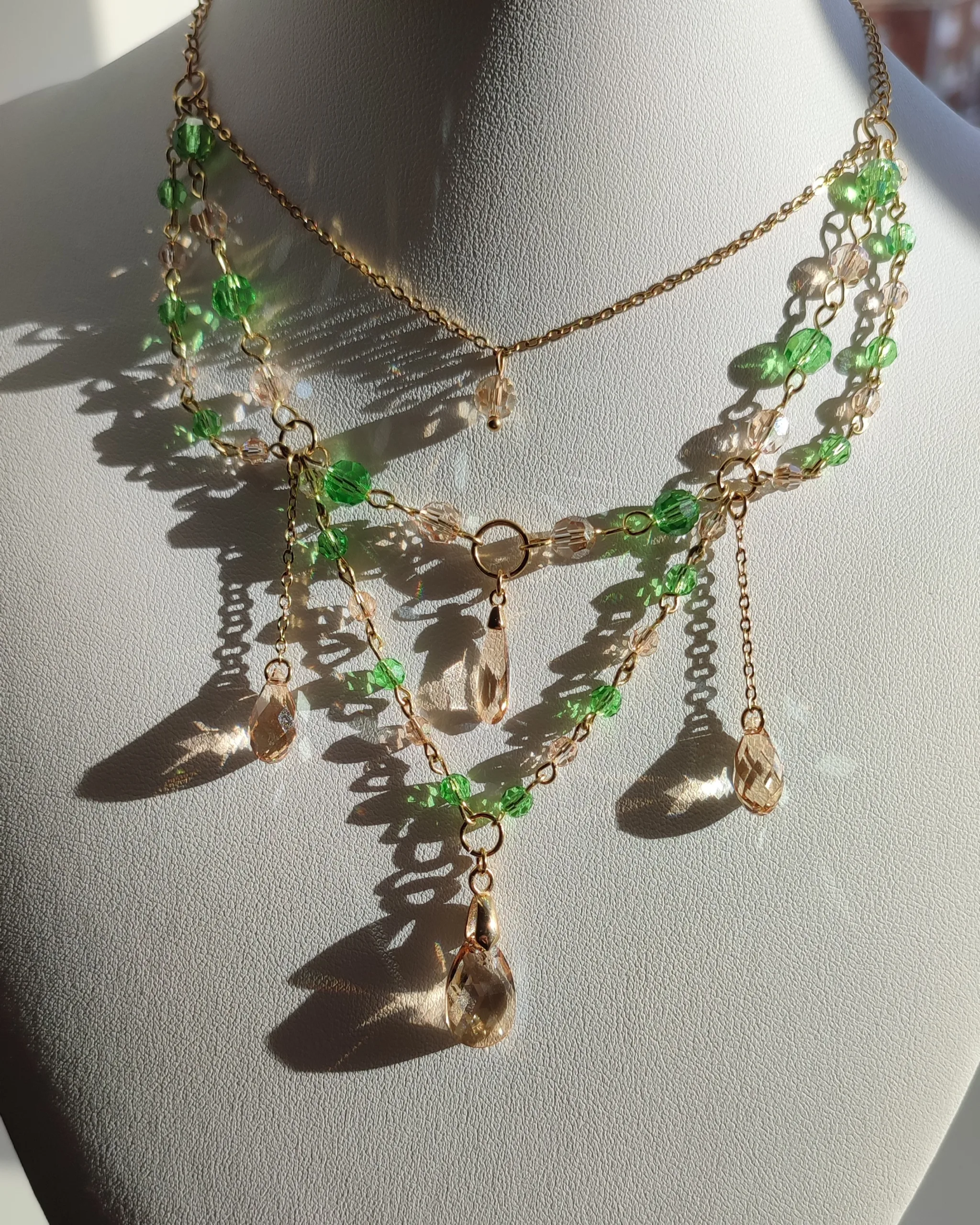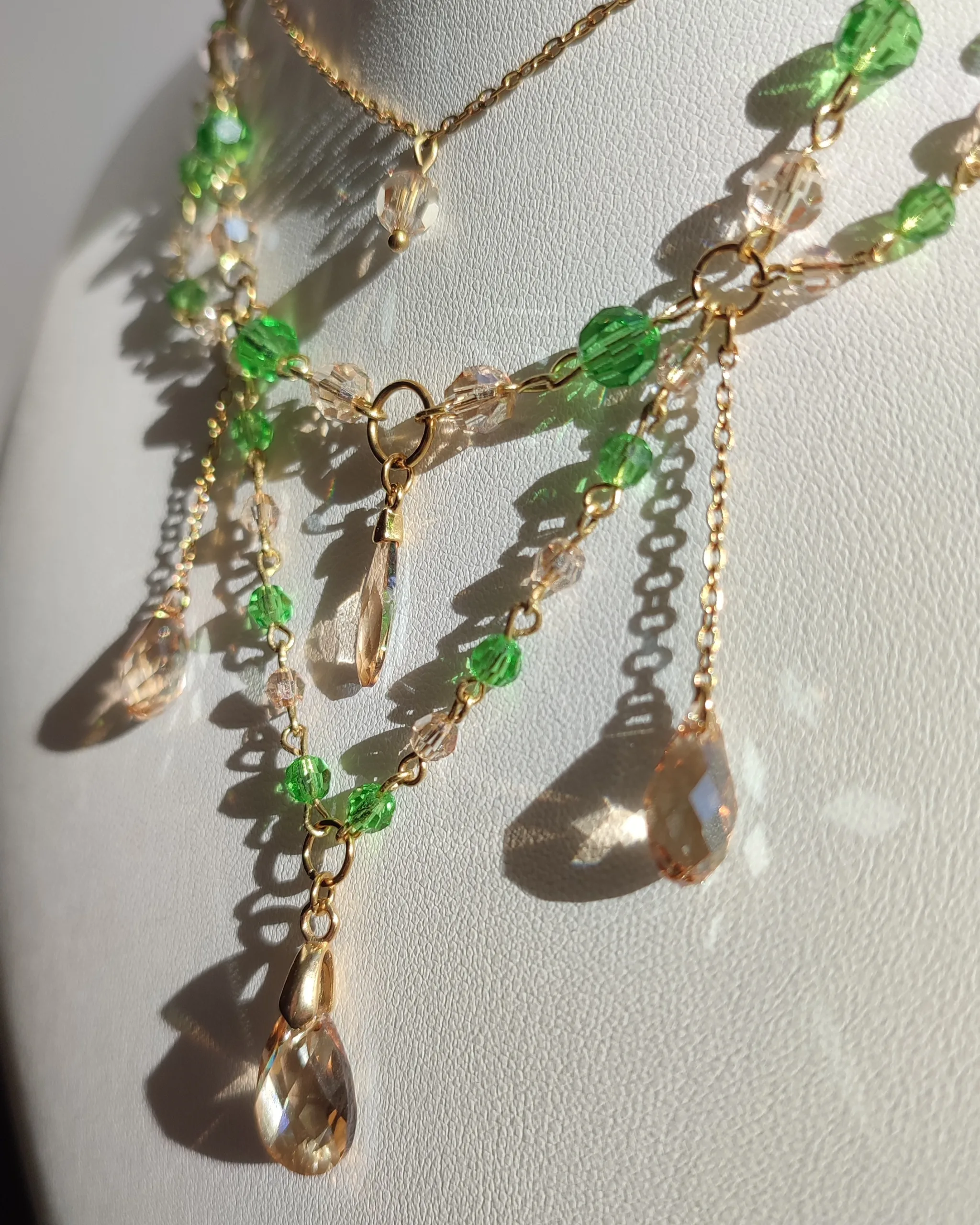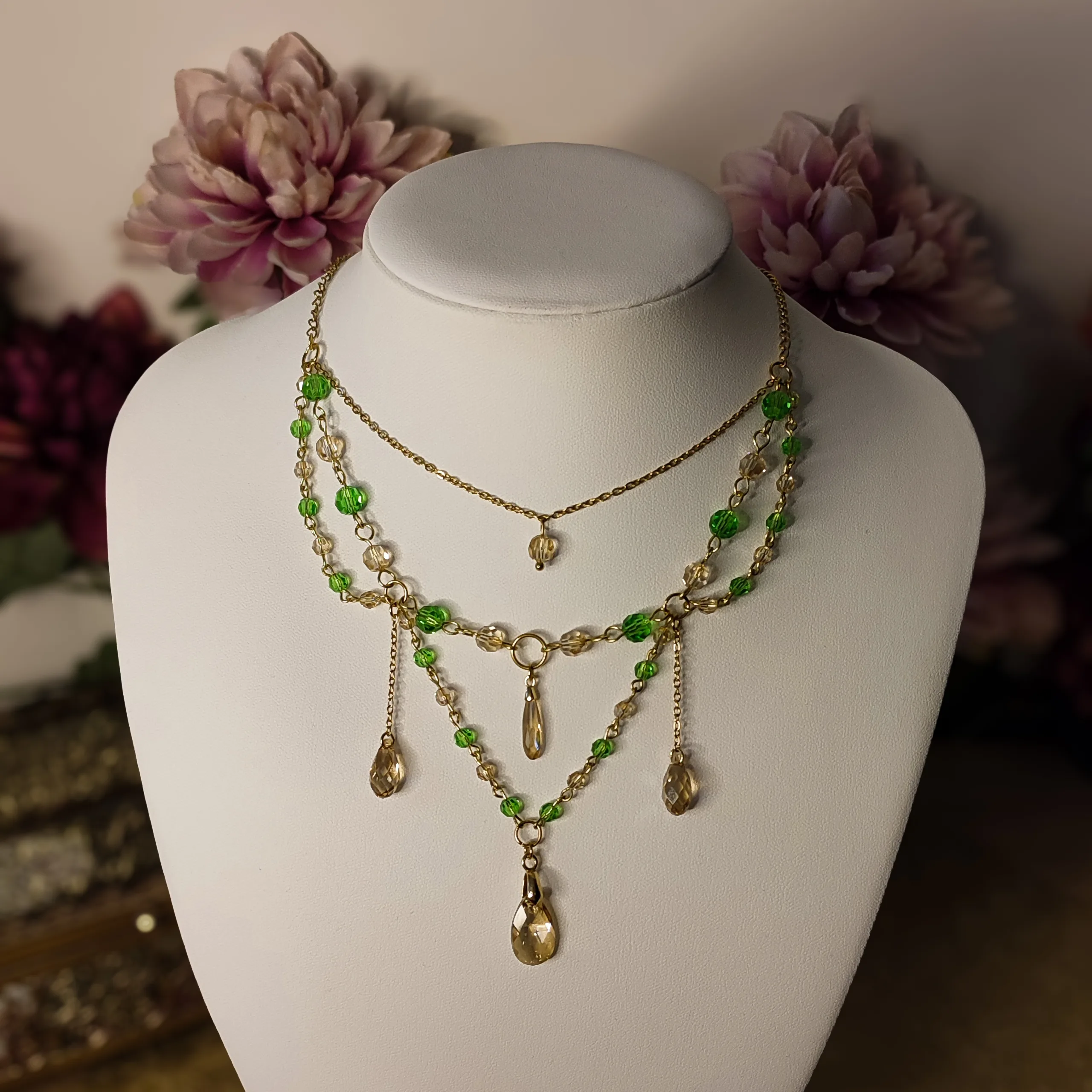 Ce collier est fait de laiton doré à l’or fin, d’acier inoxydable, et de perles et cristaux Swarovski champagne et vert, garantis sans nickel, ni plomb, ni cadmium.