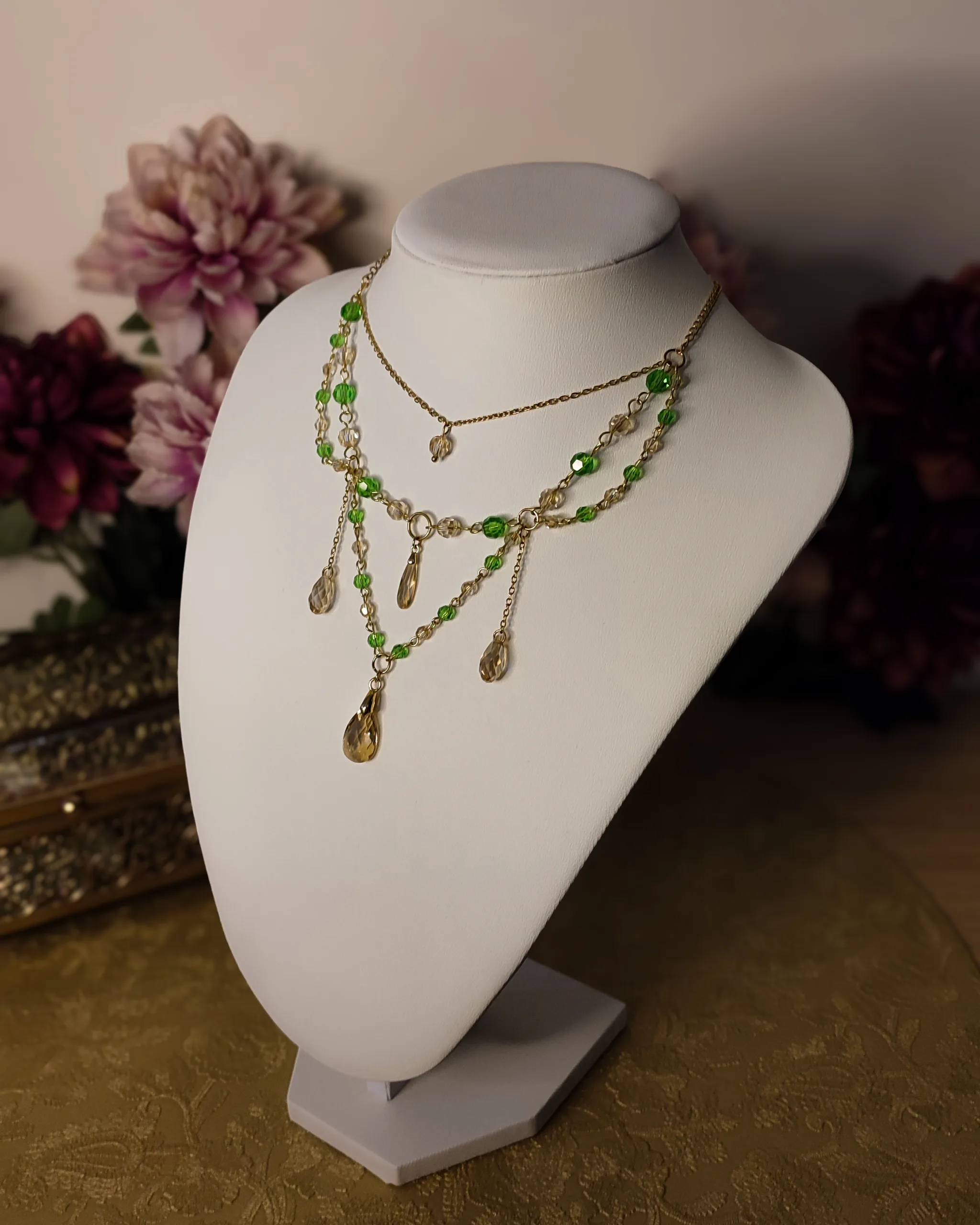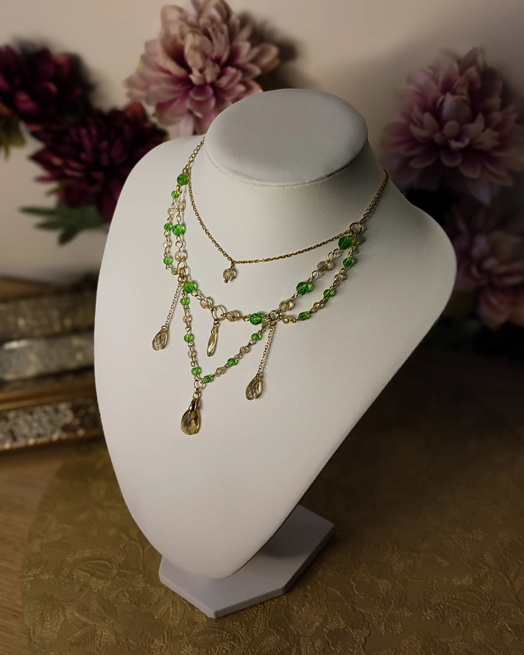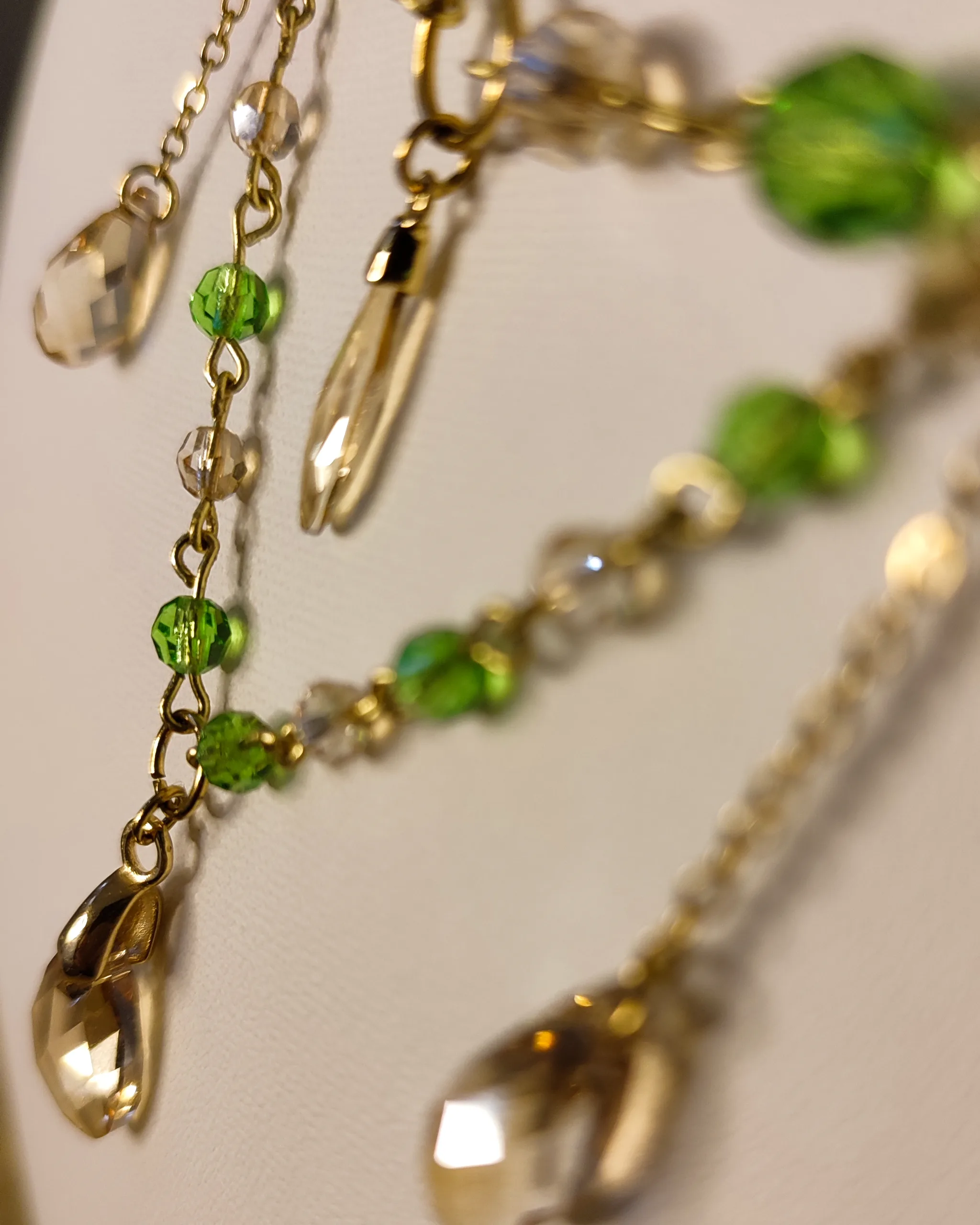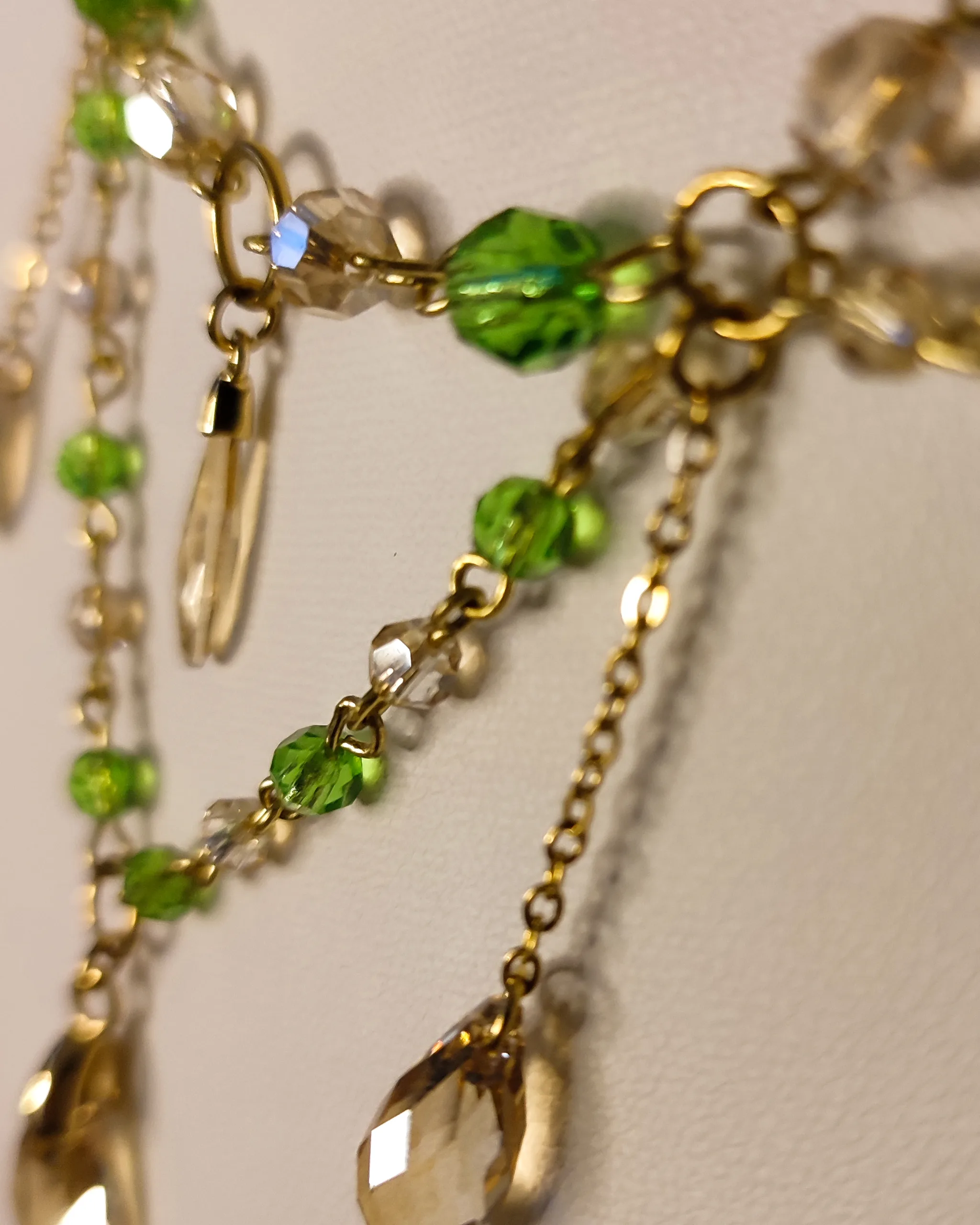Ce collier est fait de laiton doré à l’or fin, d’acier inoxydable, et de perles et cristaux Swarovski champagne et vert, garantis sans nickel, ni plomb, ni cadmium.