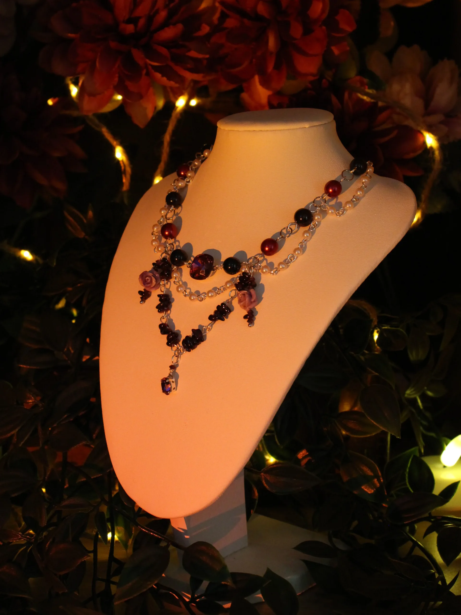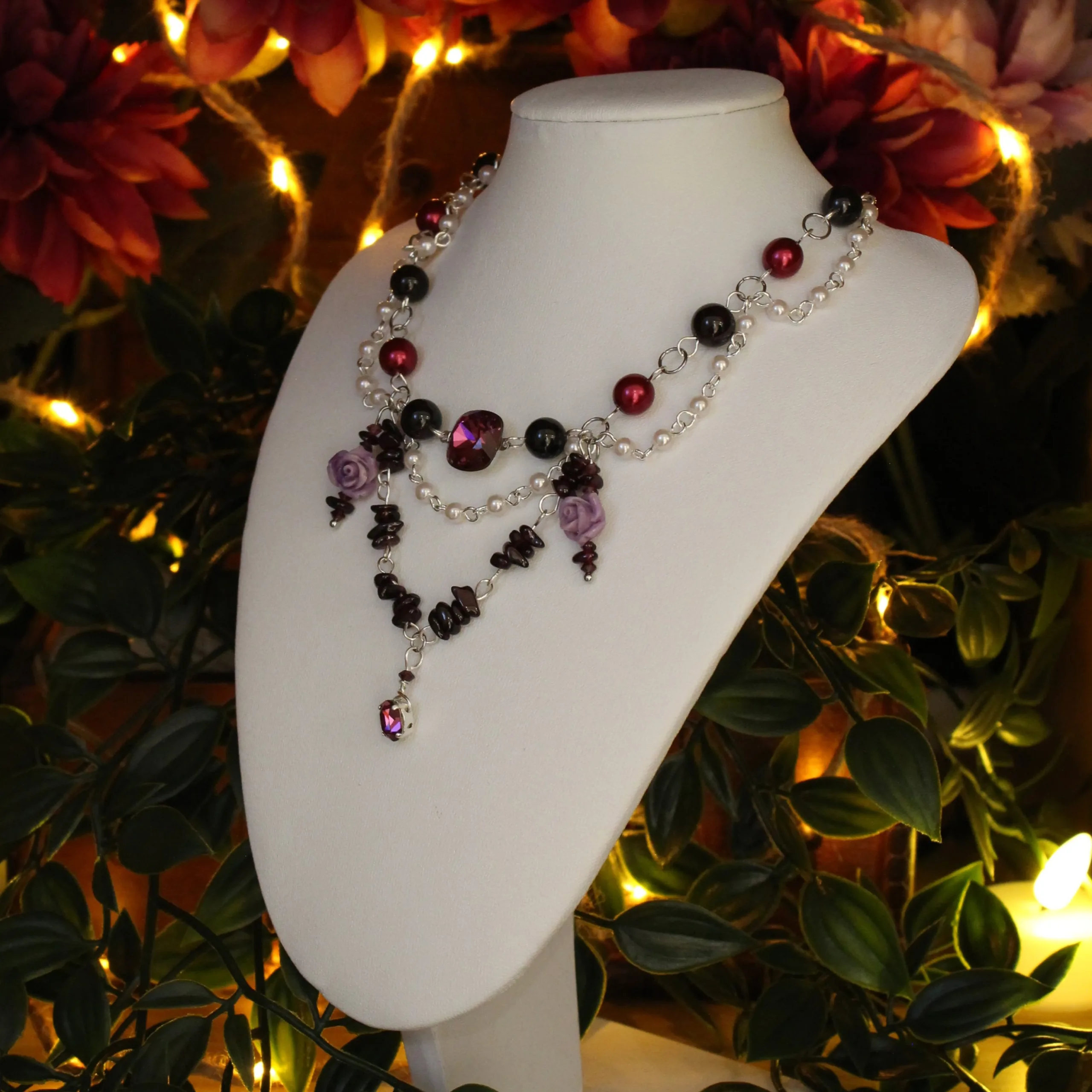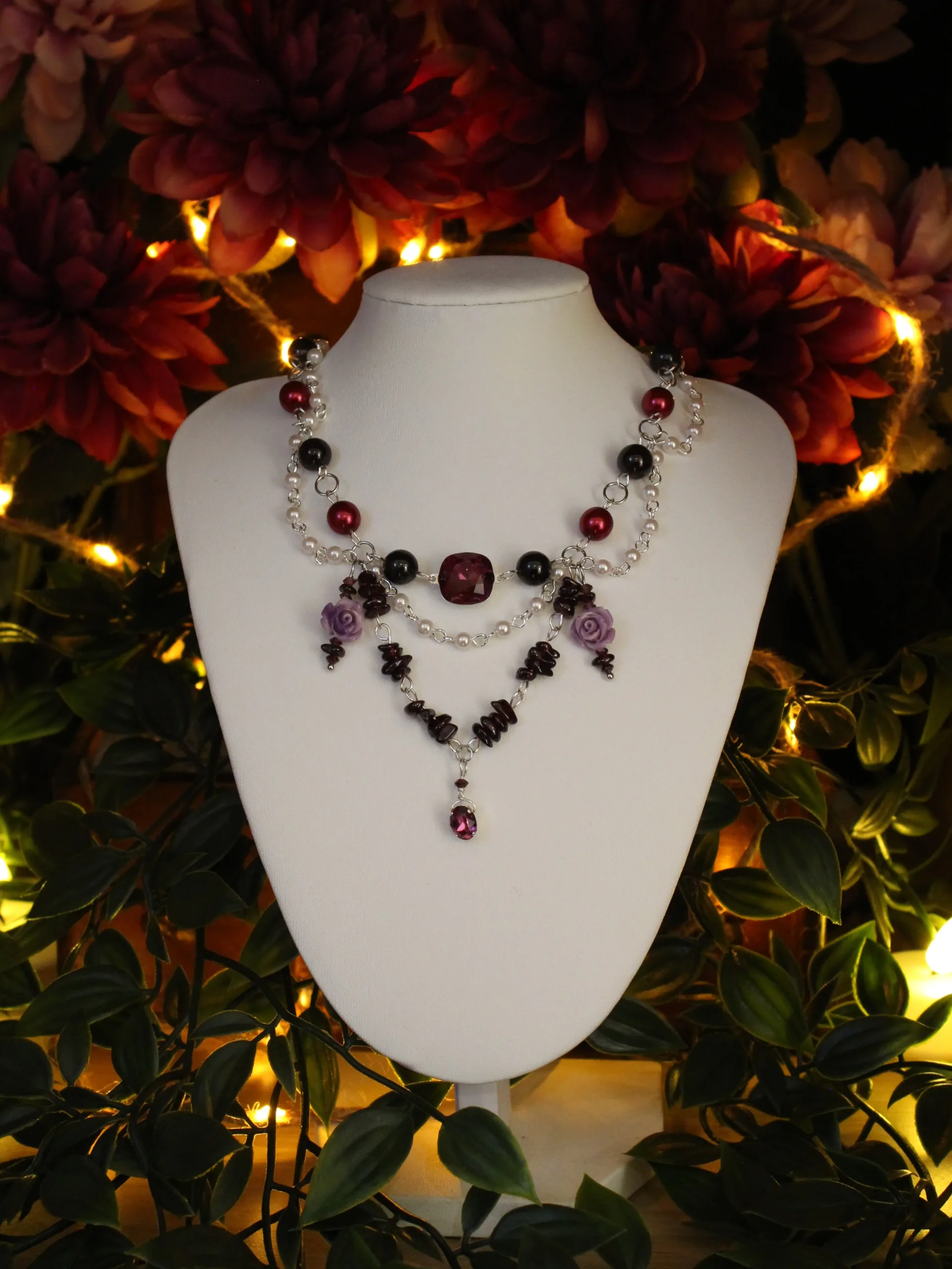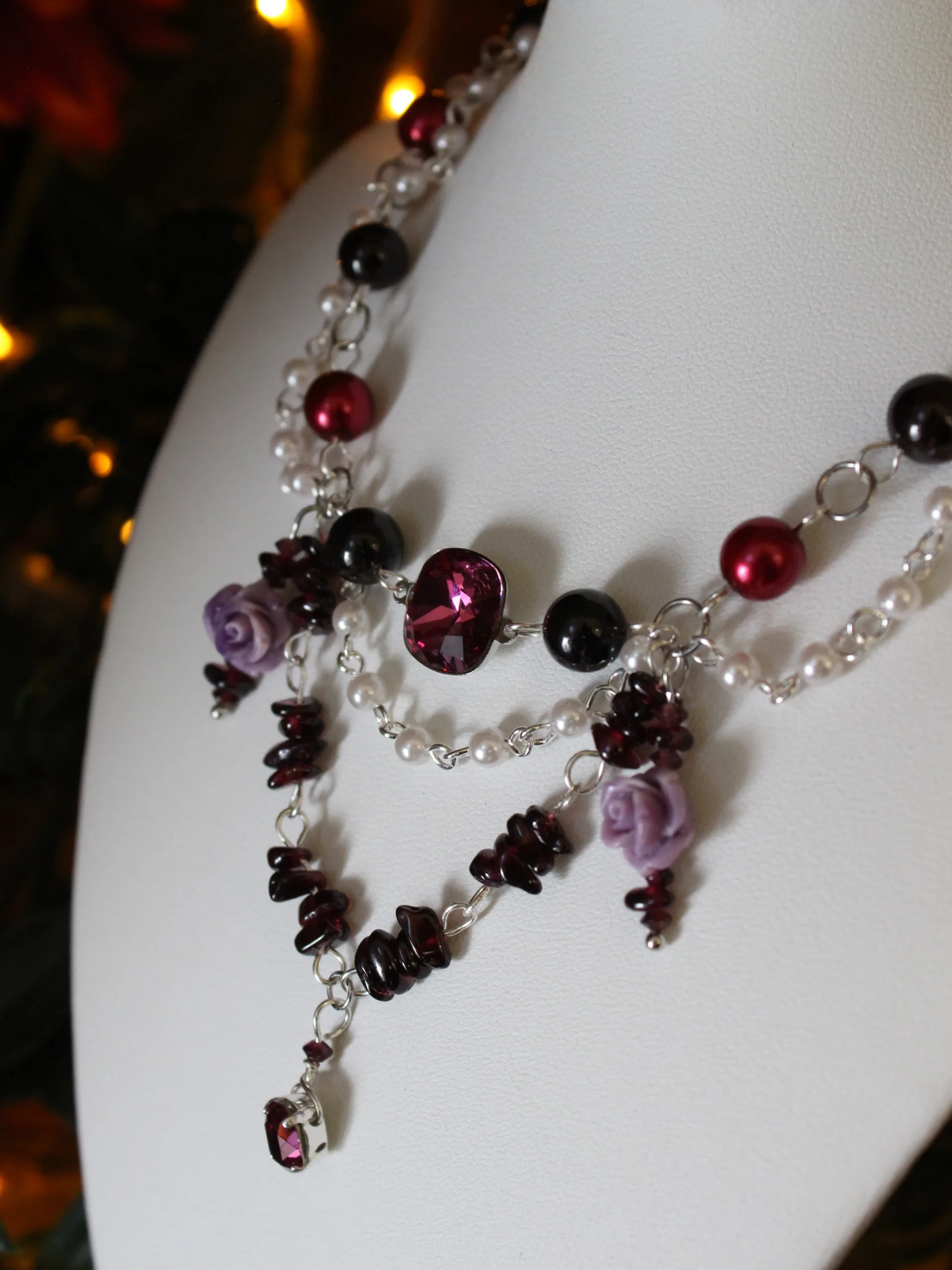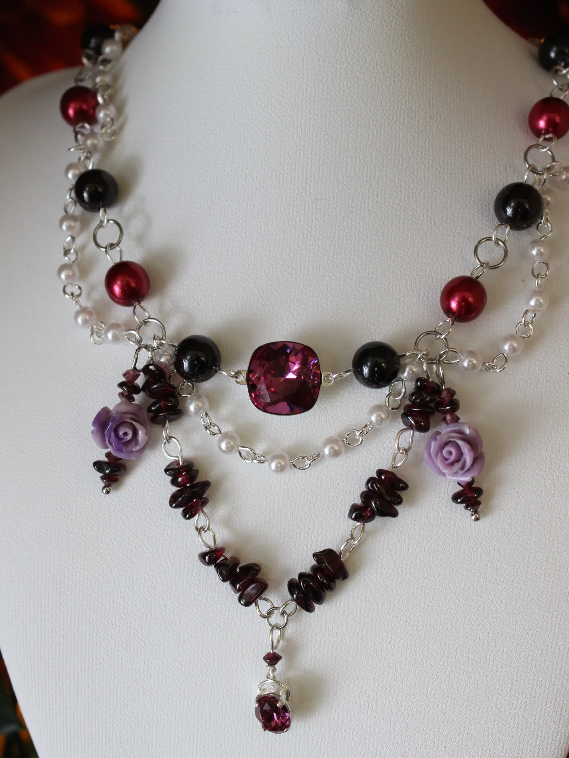 Ce collier est fait d’acier inoxydable, de breloques plaquées argent et d’argent 925, de cristaux et de perles de grenat, garantis sans nickel, ni plomb, ni cadmium.