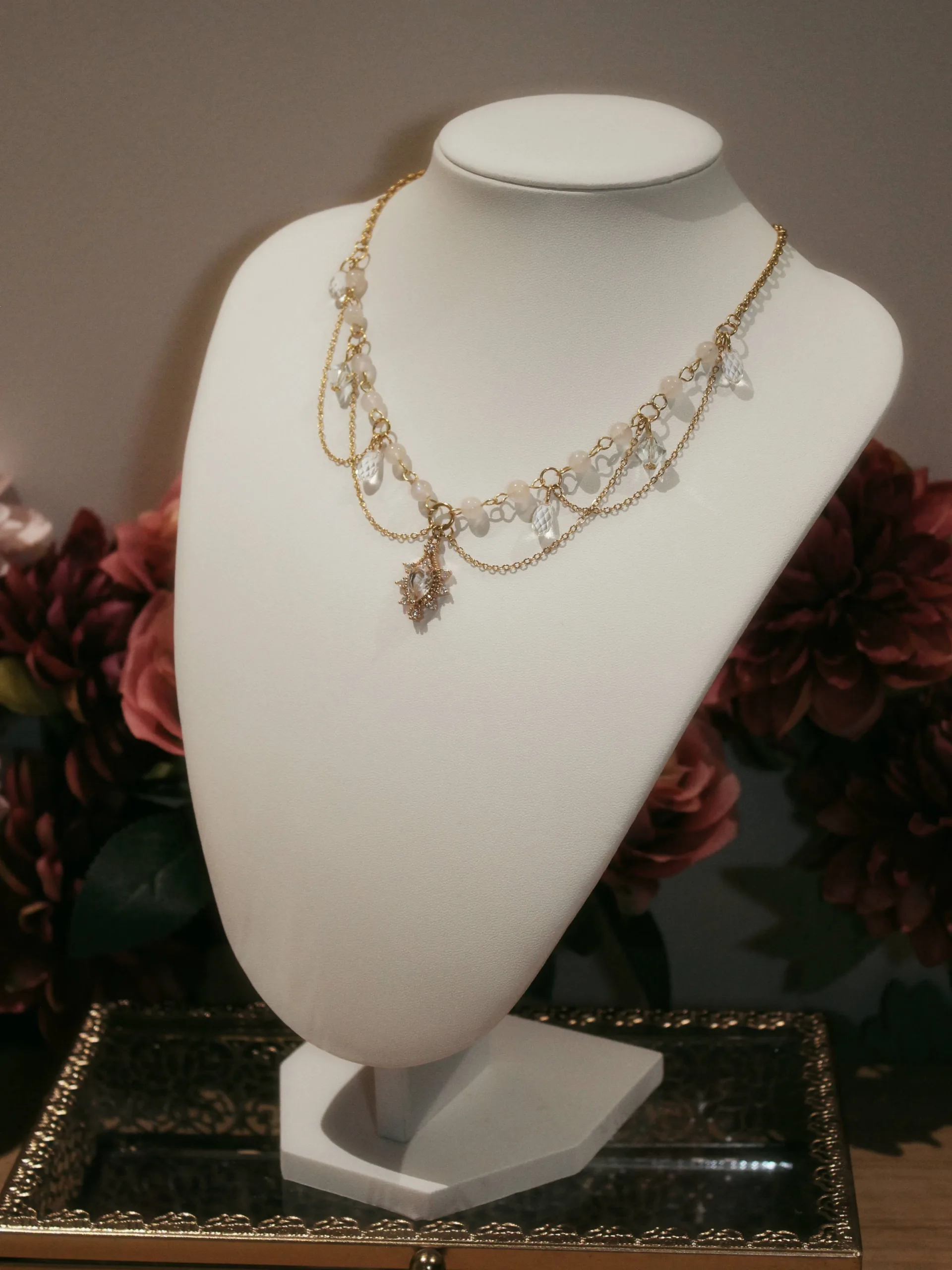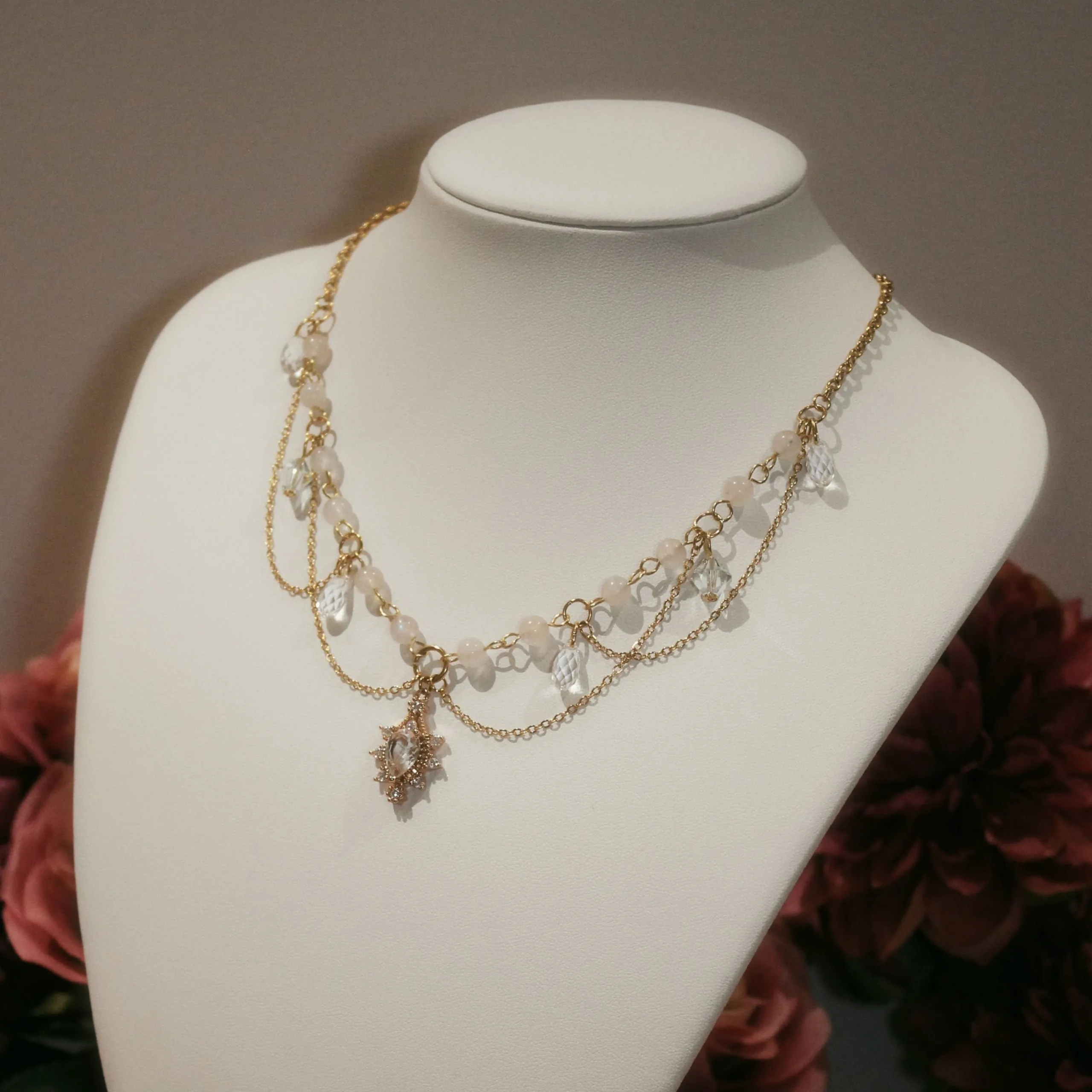 Ce collier est composé d’acier inoxydable, de perles de cristal blanc et de pierres de lune, garantis sans nickel, ni plomb, ni cadmium.