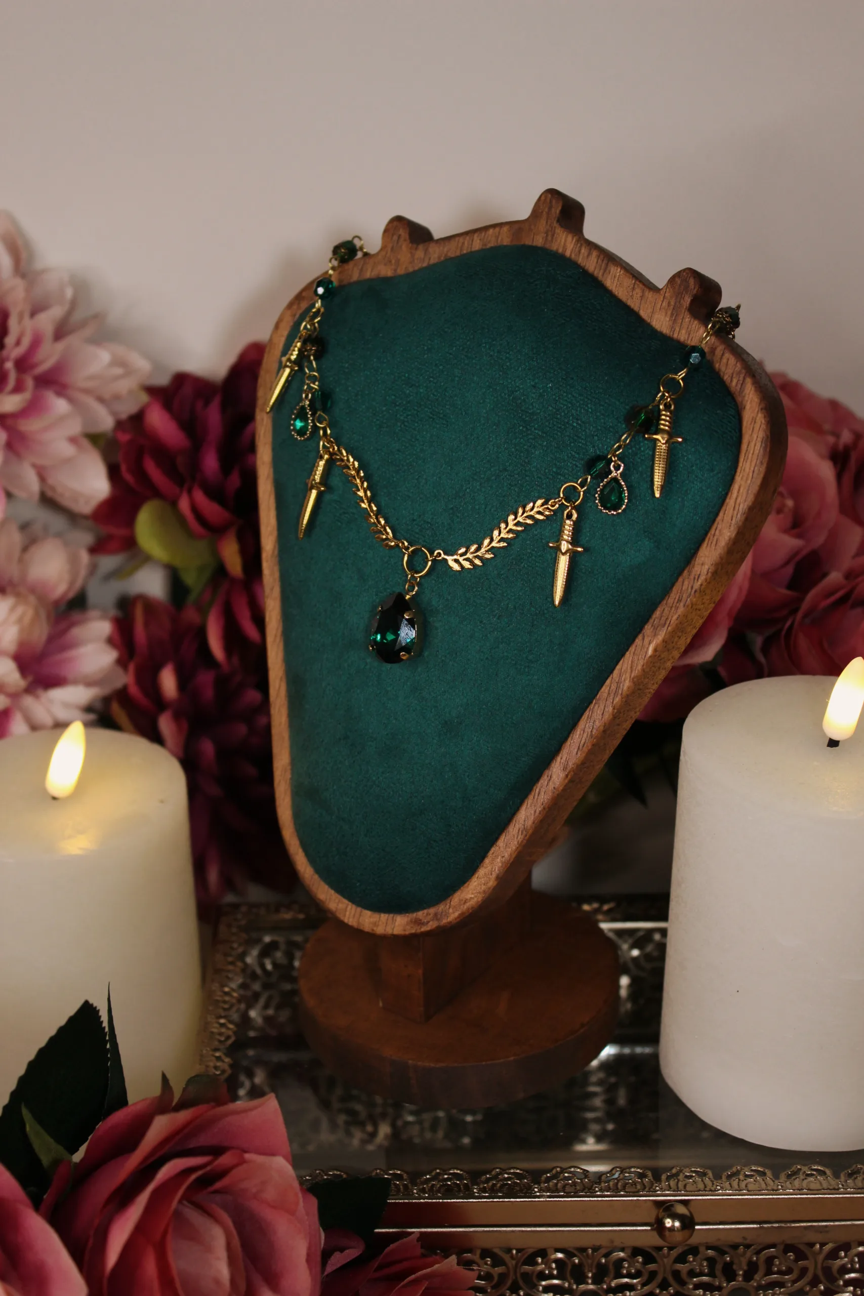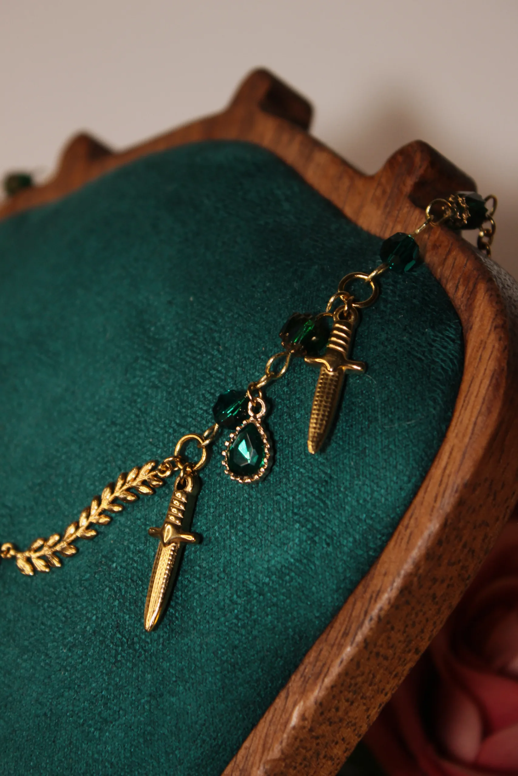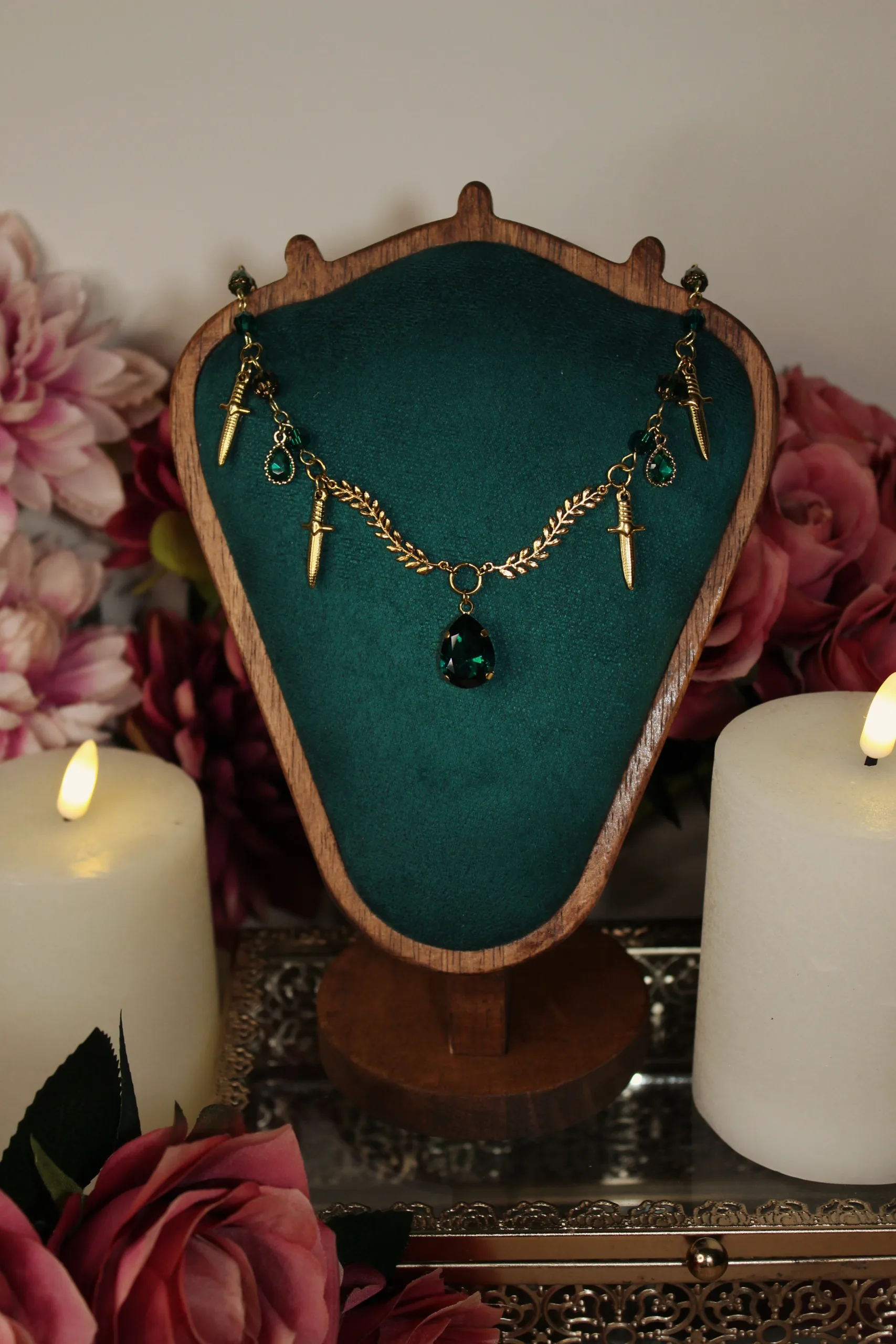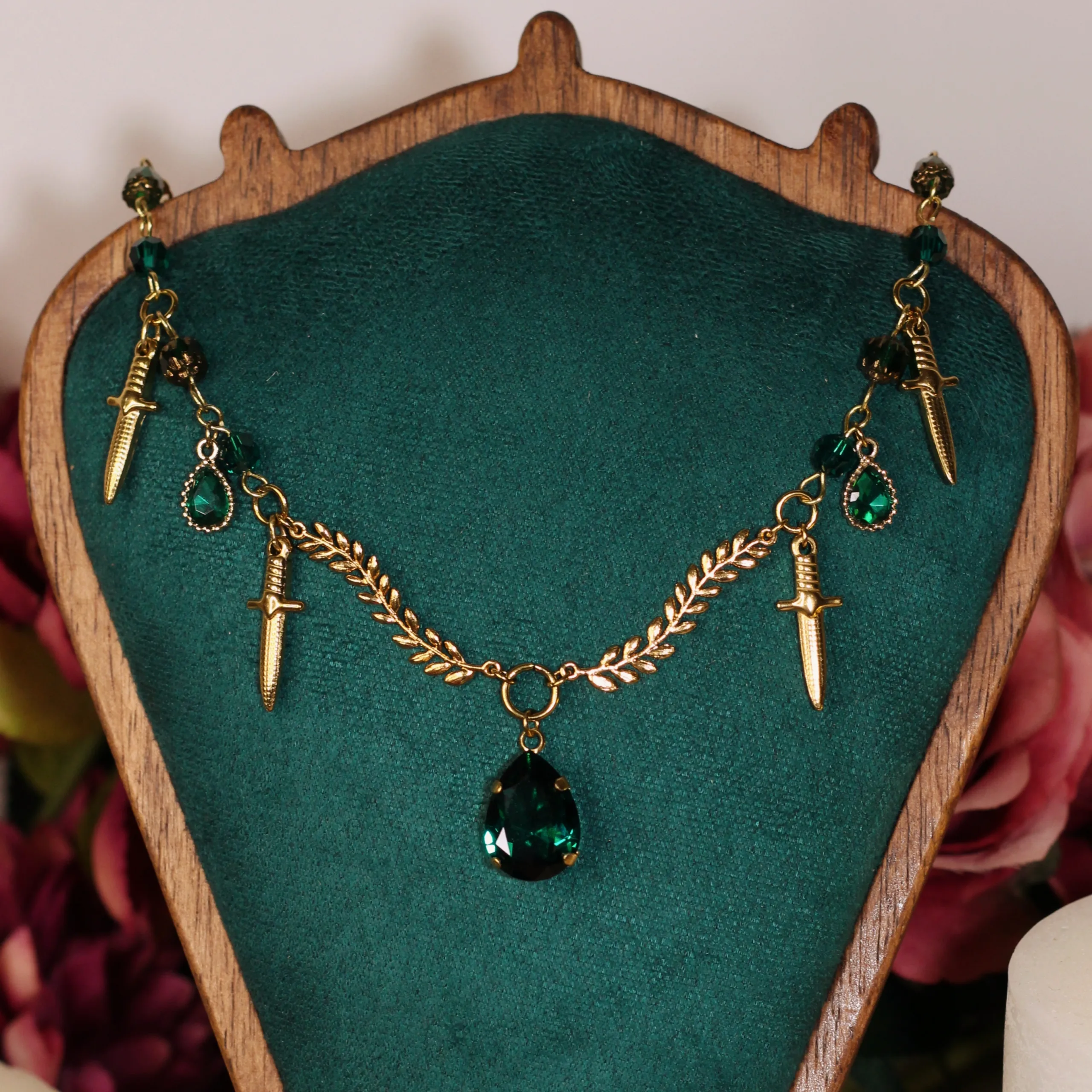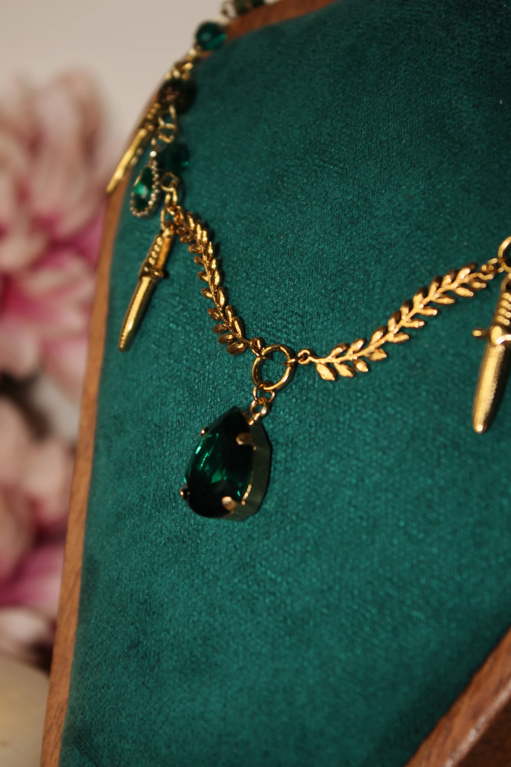 Ce collier est fait d’acier inoxydable, de laiton doré à l’or fin et de cristaux verts, garantis sans nickel, ni plomb, ni cadmium.